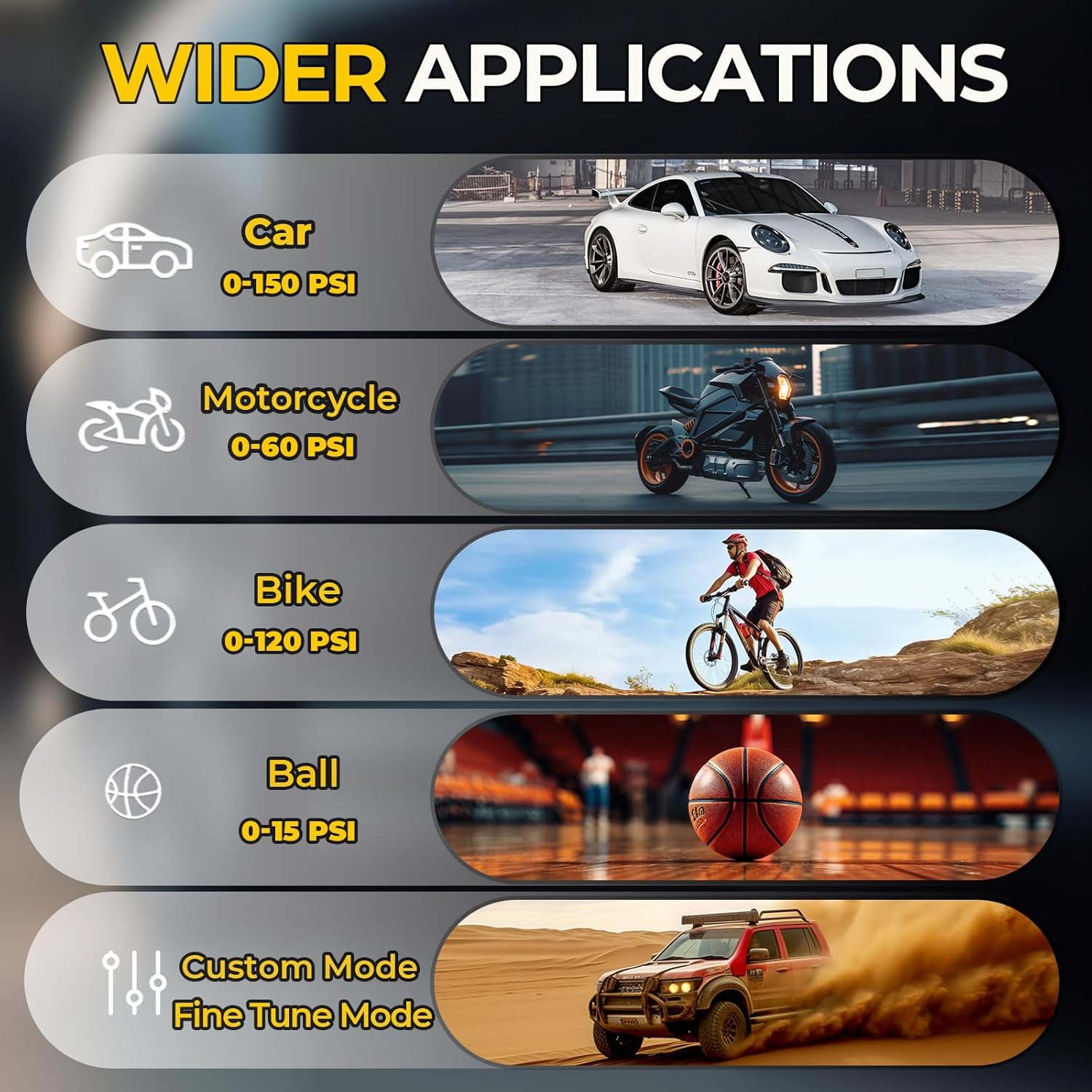 - [Emergency Inflate for Large Tires Vehicle]This portable tire pump is designed for fast inflating all tires(tire width<295mm) from 0 to 150PSI, eg. Inflate 285/70/R17 tire from 29PSI to 36PSI in 1 minutes. It is compatible with most pickups(eg. F150, Silverado, Ram, Sierra, Tacoma, etc.), cars(eg. Camry, Carrolla, Model 3, Accord, TEANA, Civic, etc.), SUVs(eg. Tesla model Y, RAV4, CR-V,Grand Cherokee, Highlander, etc.) , EVs, UTVs, ATVs, RVs, motorcycles, bikes, etc