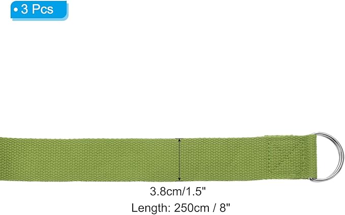 - Color: Dark Green; Material: Cotton; Length: 250cm / 8 Feet; Width: 3.8cm / 1.5 Inch; Packing List: 3Pcs x Yoga Bands