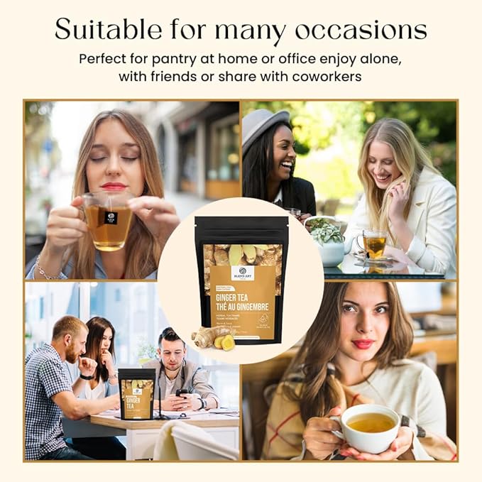- A Warm Hug in a Cup - Our Ginger Tea is a vibrant, caffeine-free brew bursting with the natural zing of fresh ginger. Known for its digestive and warming properties, this tea is your go-to for soothing cold days, easing tummy discomfort, or simply waking up your senses with a spicy, invigorating flavor.