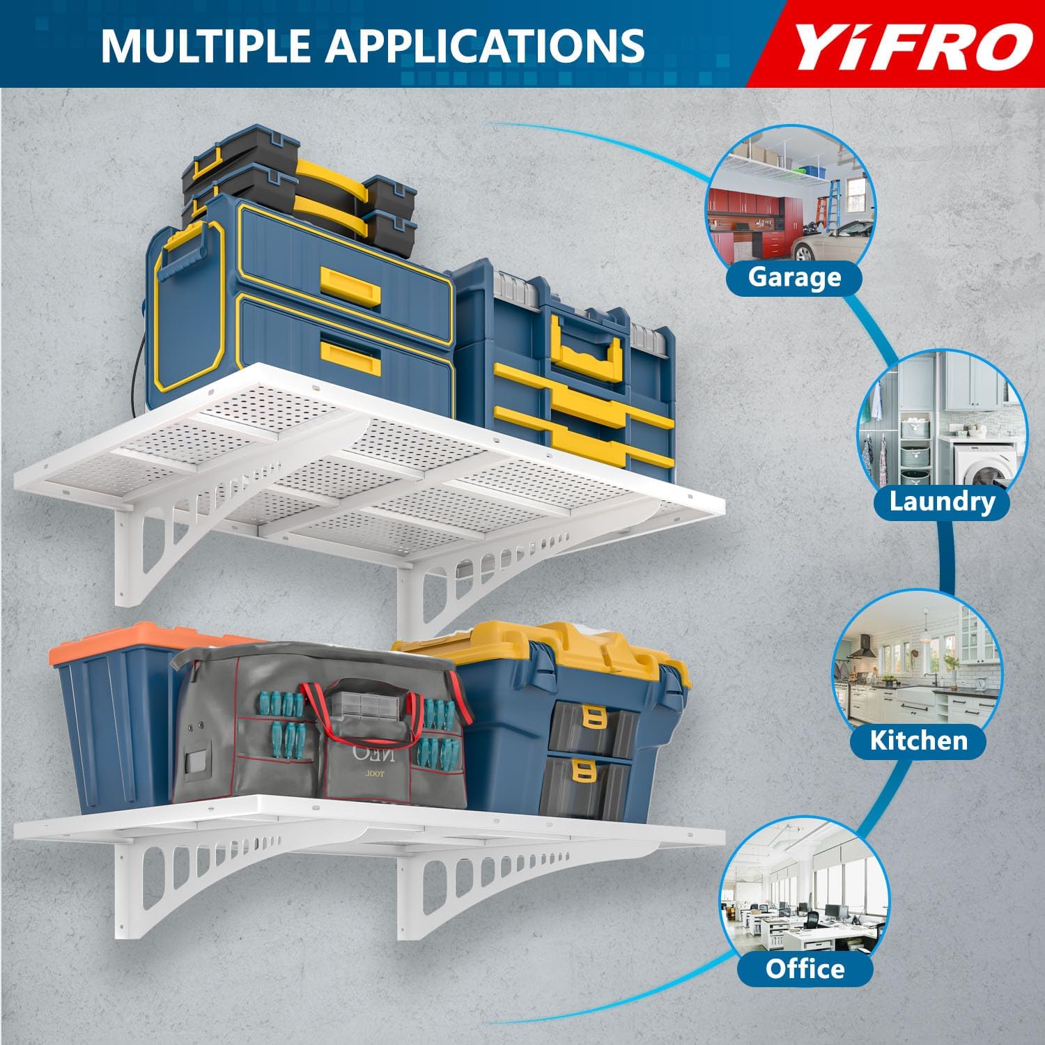 - ADJUSTABLE SPACING: YIFRO garage wall shelves is suitable for any wood post spacing, including standard 16'/18'/24'/32' spacing for installation.