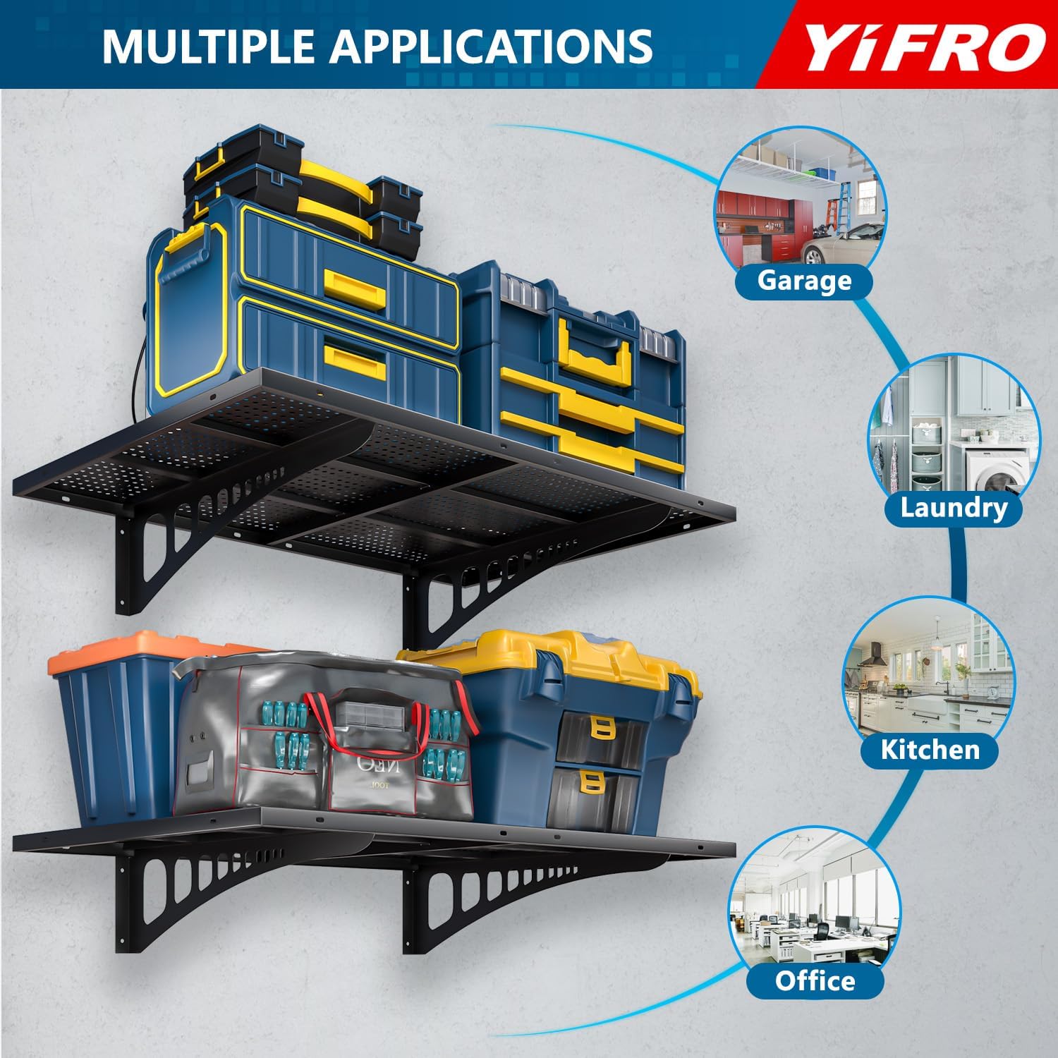 - ADJUSTABLE SPACING: YIFRO garage wall shelves is suitable for any wood post spacing, including standard 16'/18'/24'/32' spacing for installation.