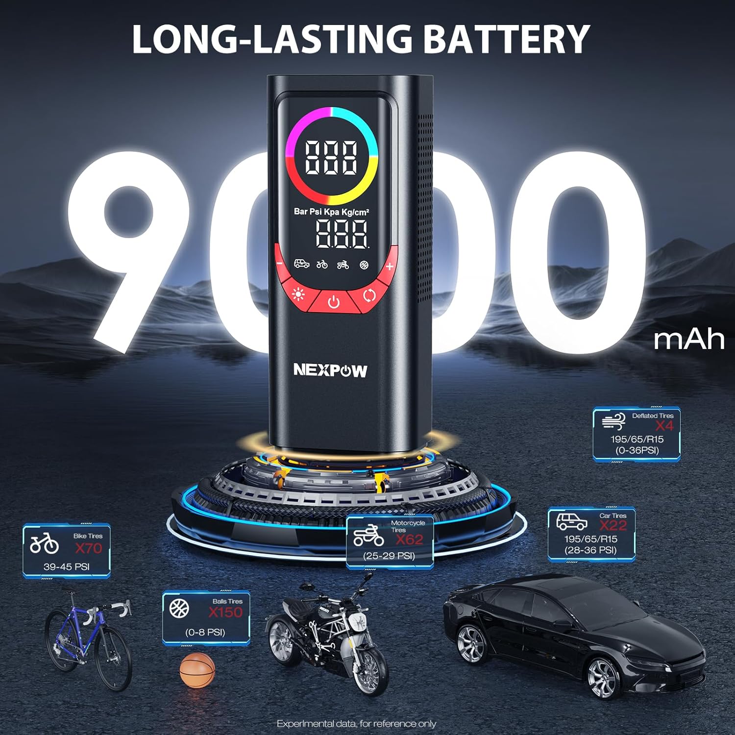 - EASY TO USE & AUTO SHUT-OFF: With 4 preset inflation modes and a custom mode, the NEXPOW car air pump is easy to use even for a new beginner. The large digital display helps you read the tire pressure just at a glance. Besides, the auto shut-off function ensures the inflator stops once the preset pressure is reached, preventing over-inflation and delivering precise results every time. Just set it and let it do the work!