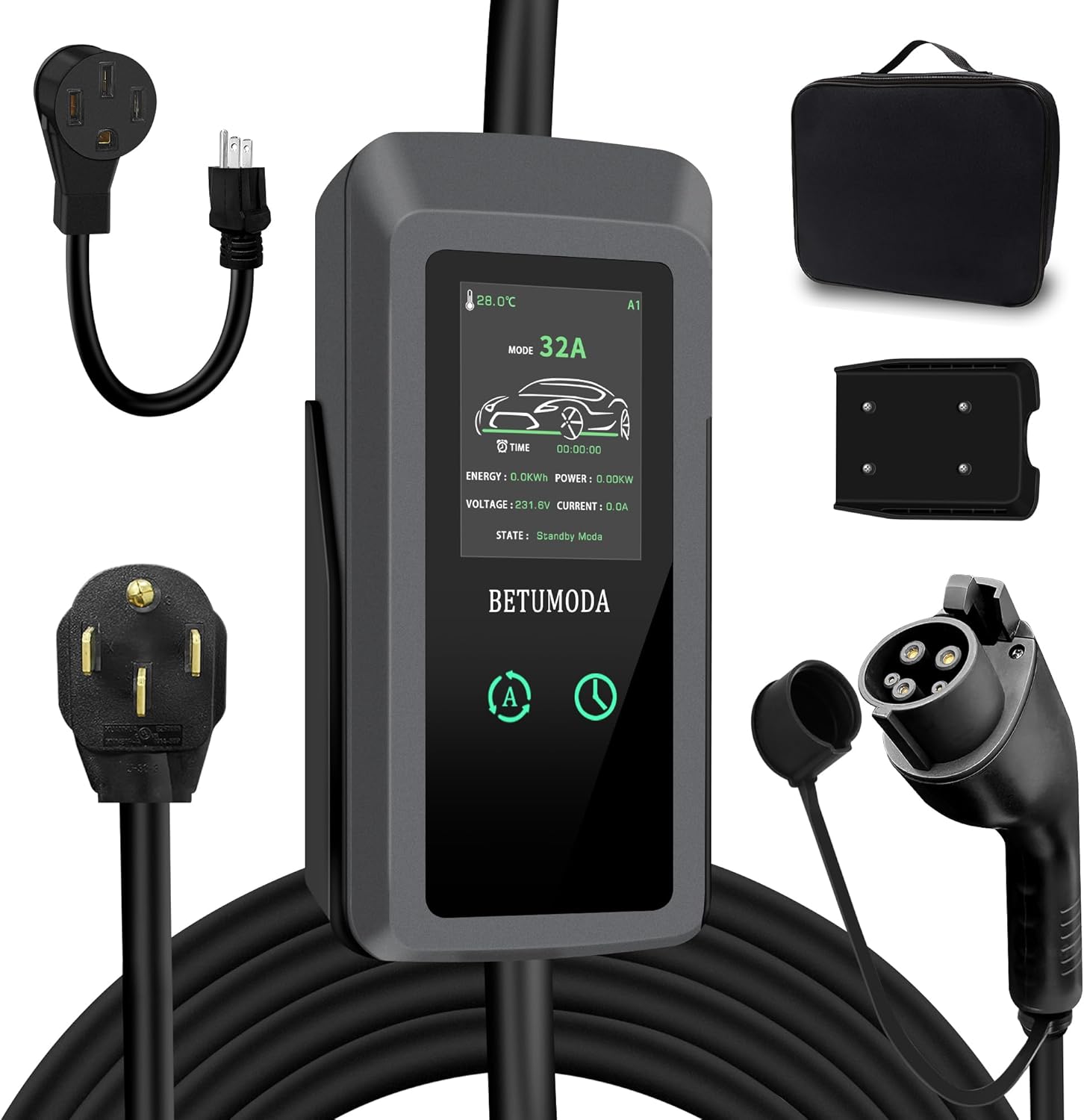 Level 2 EV Charger, 32 Amp, Portable Charger for Home and J1772, 25ft Cable, 240V, Charging Stations with LED Display, NEMA14-50 Plug, Current Adjustable.(Tesla Need Adapter)