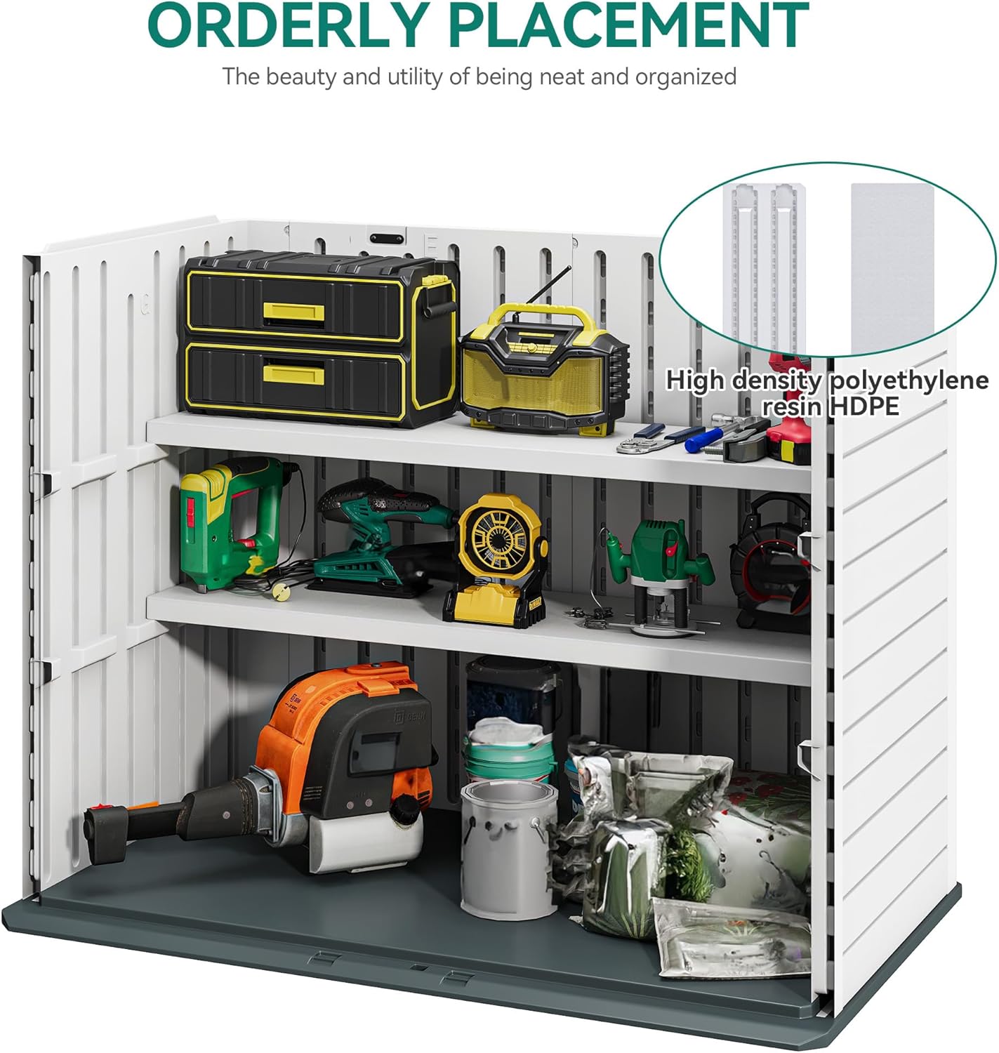 • Robust Build: Using tough HDPE material, the space-saving shelf for outdoor storage sheds ensures sturdy support for your belongings, promising longevity and protection for your shed contents