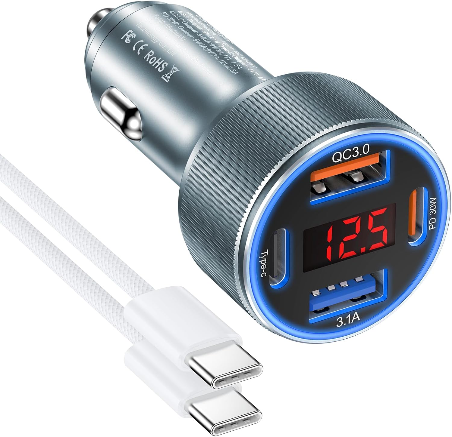 Car Phone Charger for iPhone 16 15, Besgoods USB C Car Charger Adapter 4 Ports with Voltmeter PD&QC Fast Charging Cigarette Lighter for Galaxy S25 S24 S23 A54 A15 Dash Cam, with 6ft USB C to C Cable