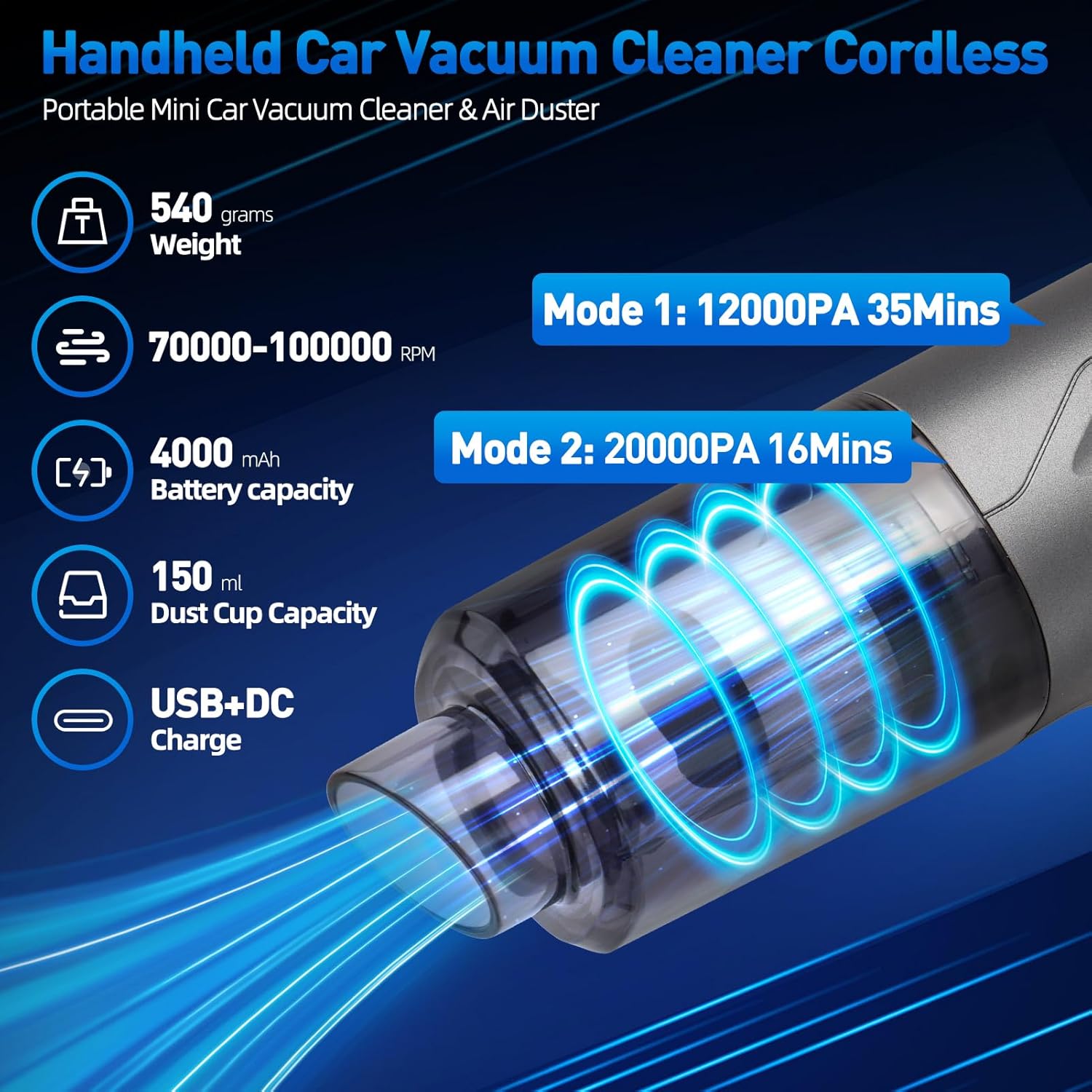 - ăSuction & Blow 4 in 1ă Our handheld car vacuum cleaner offers versatile functionality, combining suction, blowing, charging, and vacuuming. With powerful 20,000PA suction, it's perfect for cleaning your car and home. Easily remove debris from stubborn crevices, windows, and desktops, and use it to clean keyboards or inflate items. This multi-use tool covers all your cleaning needs.