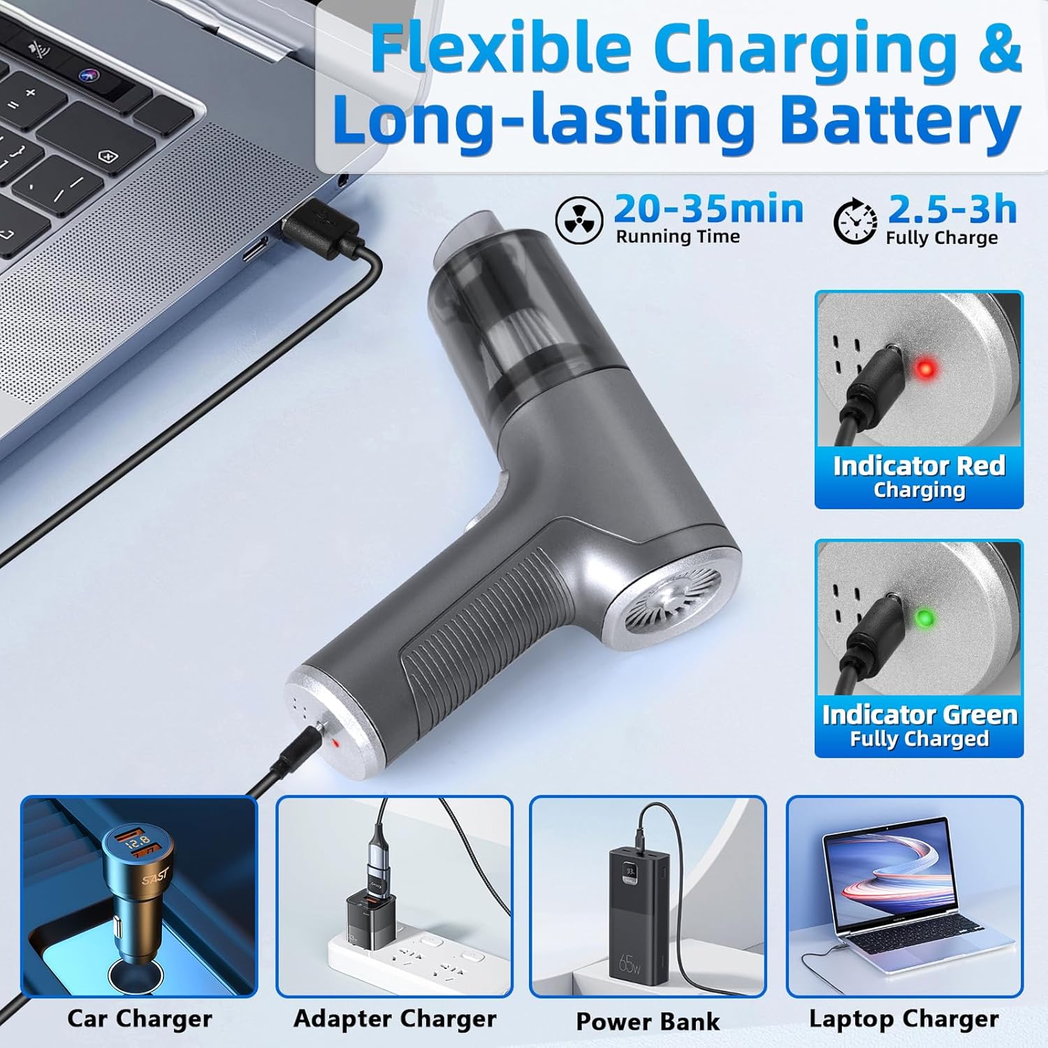 - ăRechargeable Battery and Portableă This mini car vacuum cleaner features a built-in 2*2000mAh battery and a Type-C fast charging cable, allowing full charge in just 2.5h~3 hours for 4-in-1 functionality. The Type-C port makes recharging easy with car chargers, power banks, or laptops. Weighing only 540g, itâs lightweight and portable, taking up minimal space.
