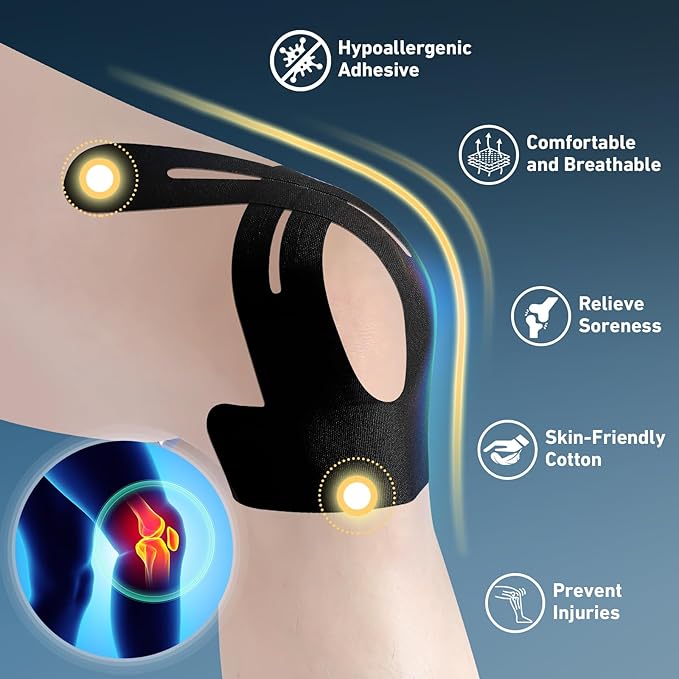 - BREATHABLE AND SKIN-FRIENDLY COMFORT - This k tape for knee features improved airflow and a hypoallergenic design to prevent irritation. The athletic tape is lightweight and flexible, ensuring all-day comfort.