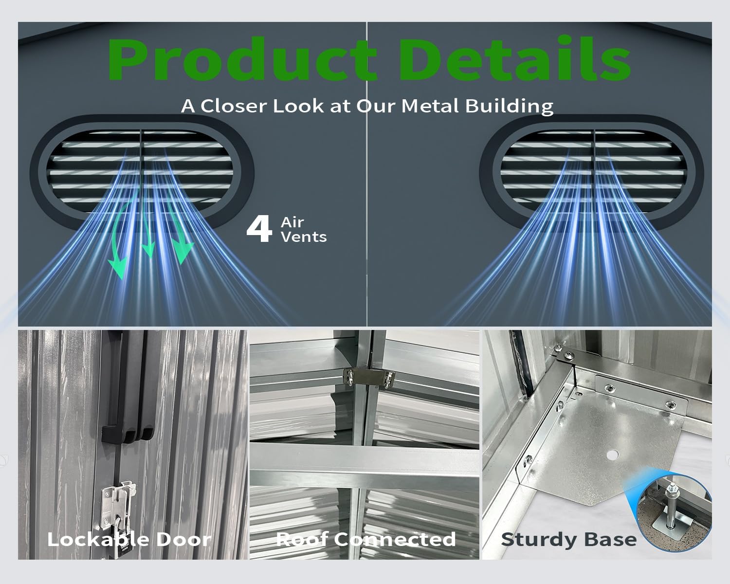 - ๐ก๐๐ฅ๐ฅ-๐ฐ๐๐๐ญ๐ก๐๐ซ ๐๐๐ญ๐๐ฅ ๐๐ก๐๐: This huge outdoor storage shed is waterproof with a sloped roof, effectively preventing leakage or accumulation from heavy rain or snow. It features 4 vents for improved air circulation, keeping your tools in good condition. The sloping roof and lockable door also help prevent odors and reduce moisture. With a lockable design, this tool shed provides hidden storage space.
