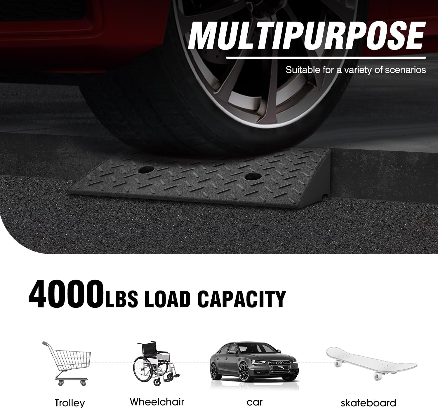 - WIDELY USED - From small to medium-sized vehicles to toy cars, It can greatly protect the safety of going up and down stairs, and are also a good choice for mobility issues; Widely used in households, warehouses, garages, etc; If you are concerned about the smell of rubber, we suggest that you can leave the wheelchair ramp outdoors for more than 1 days for ventilation.