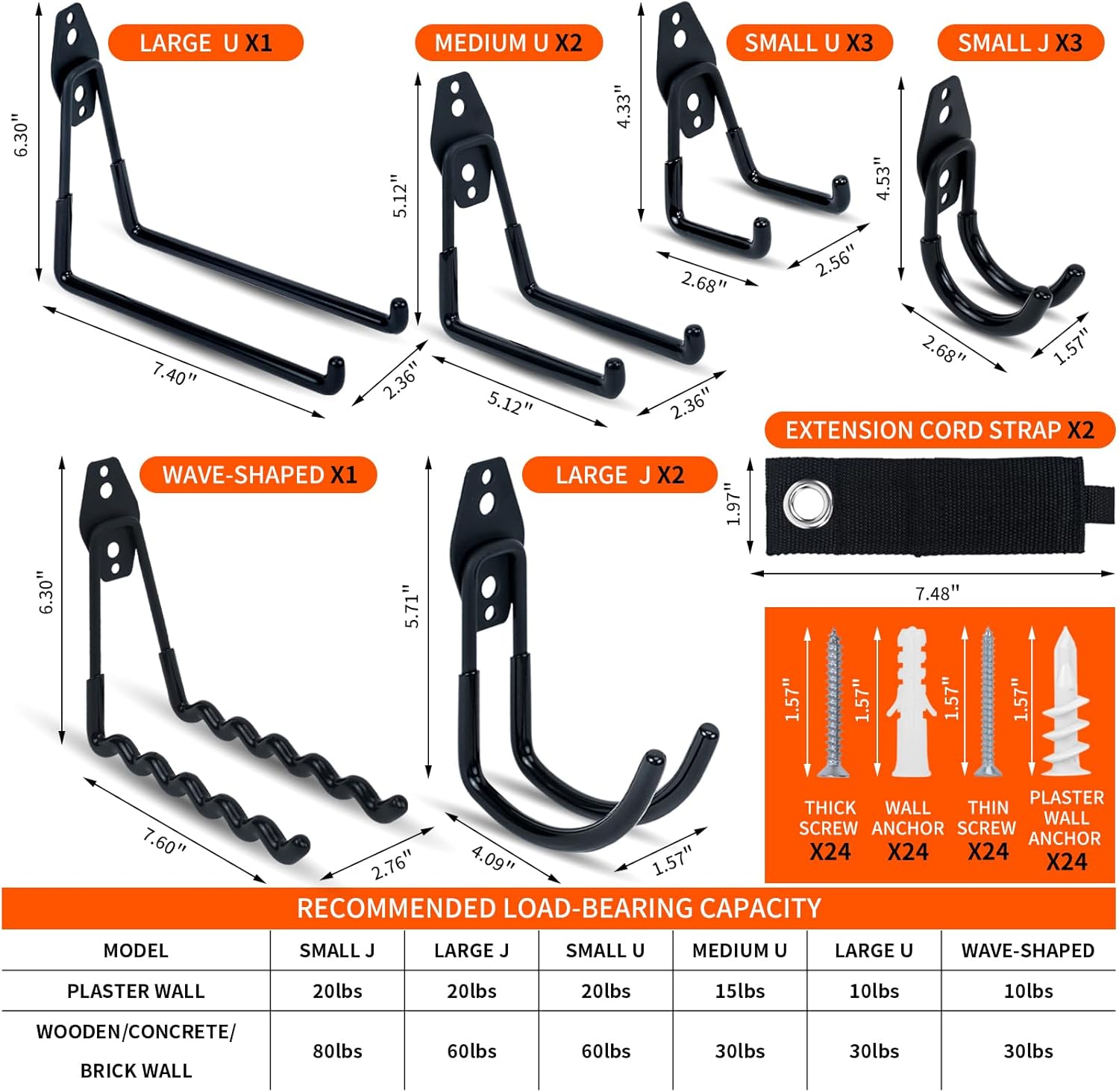 - What You Get: 2 extension cord straps, 3 small J hooks, 2 large J hooks, 3 small U hooks, 2 medium U hooks, 1 large U hook, 1 wave-shaped hook, 24 thin screws, 24 thick screws, 48 wall anchors, 1 user manual and our friendly customer service.