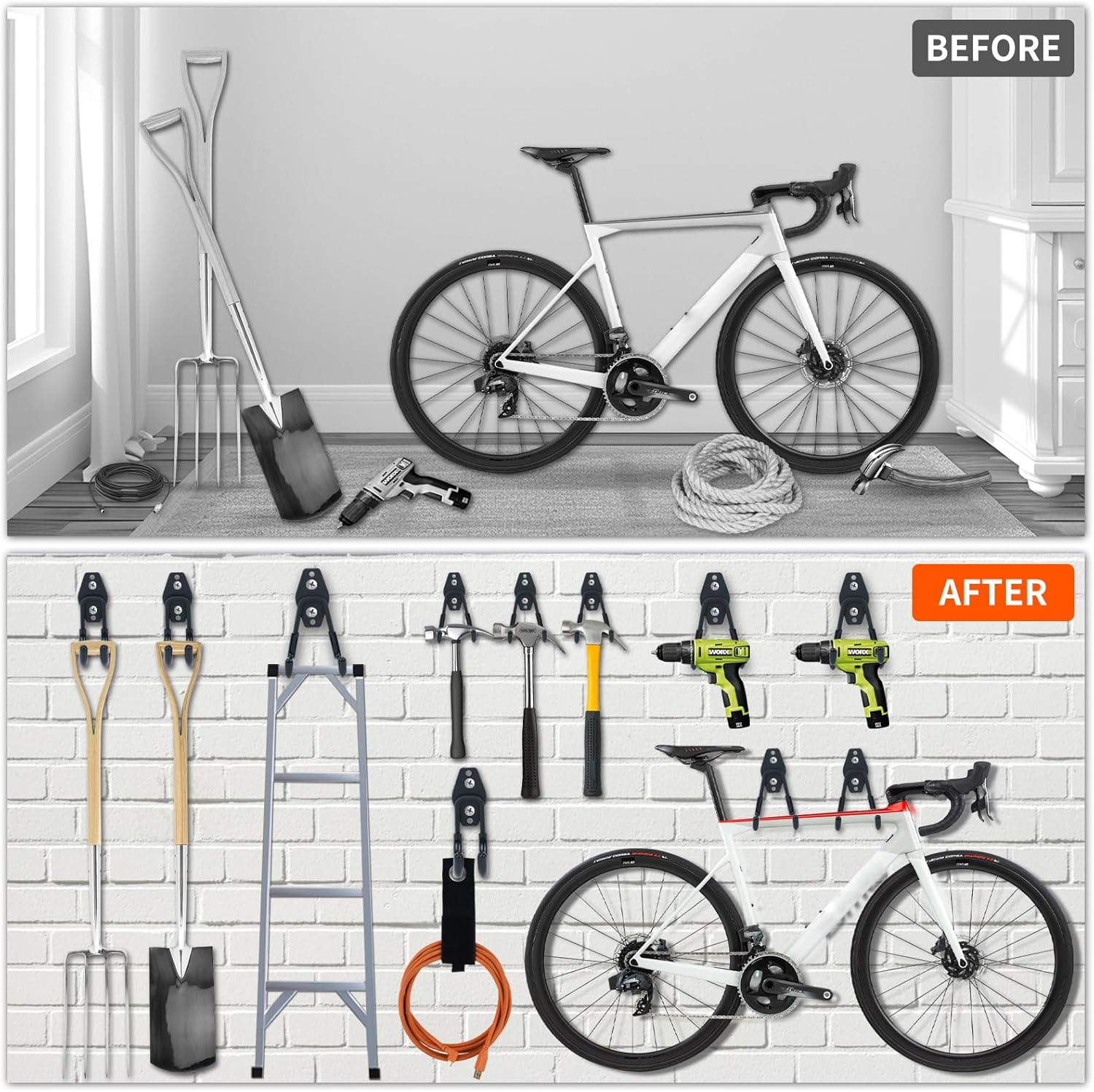 - Space Saving: This hooks kit with 2 extension cord straps is perfect for garage organization, and free up your space such as garage, garden, yard, gym, workshop, basement, barn, shed or any other space. You can hang power tools, bikes, ladders, shovels, strollers, ropes, cables and accessories to keep your space clean.