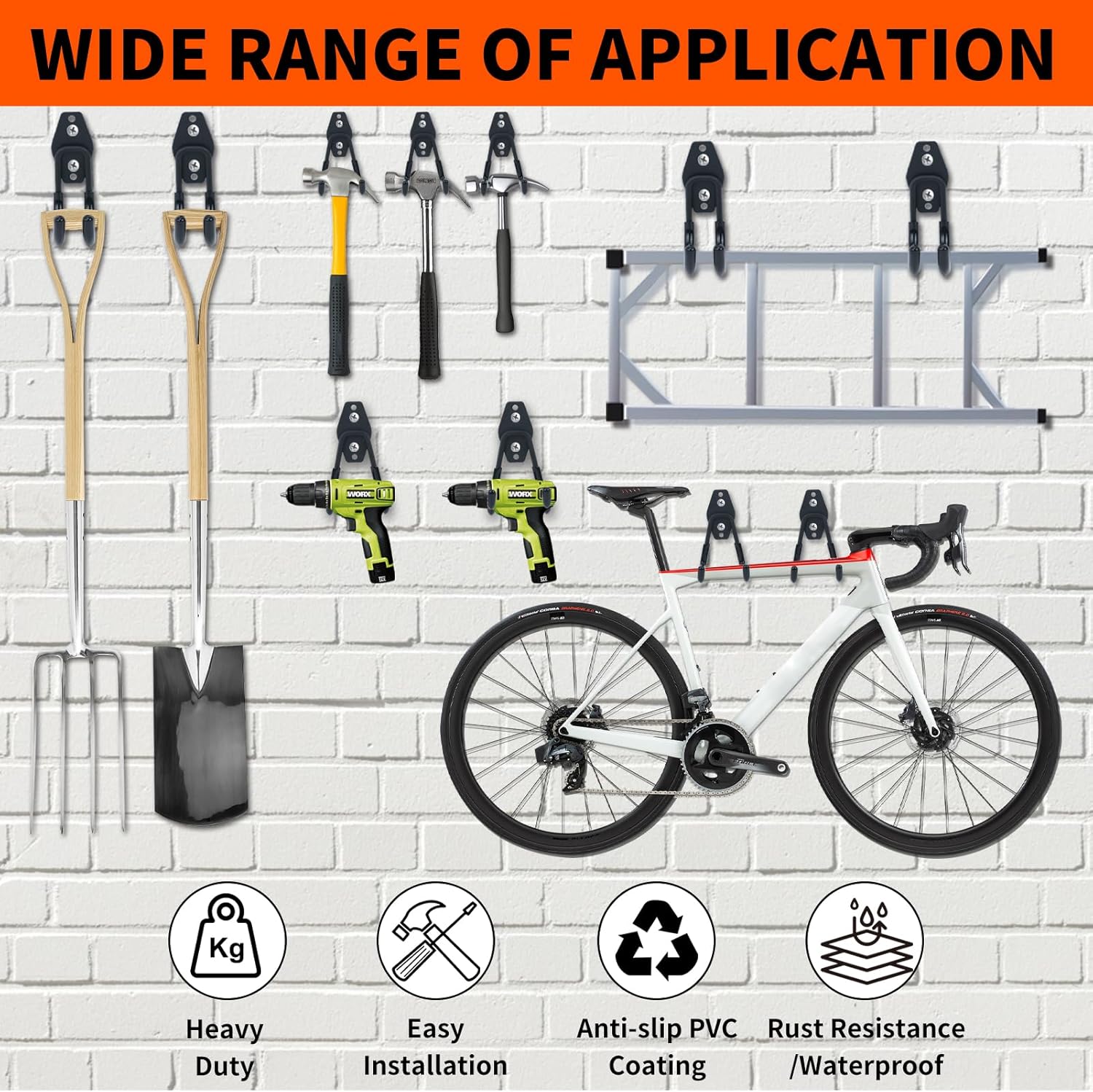 - Easy Installation: No difficult instructions or time-consuming installation. Simply with a drill and screwdriver, the garage wall hooks can easily be mounted on plaster, wooden, concrete, or brick wall.