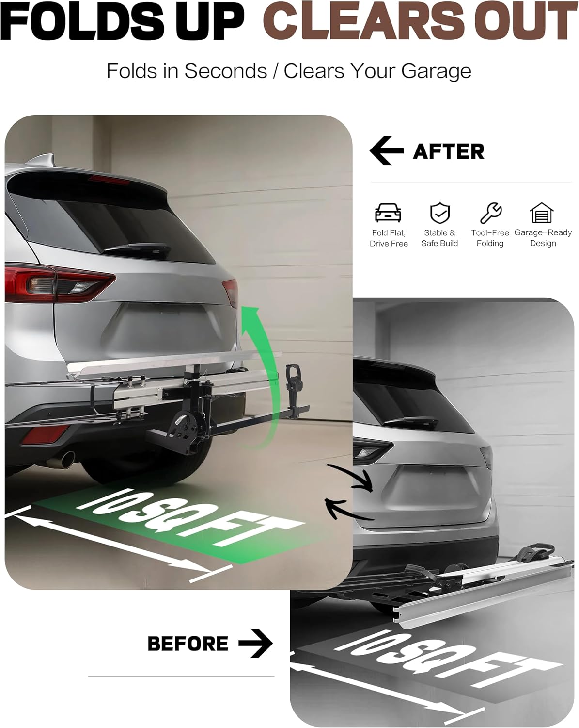 - Easy TO USE: Effortlessly load and secure bikes with our user-friendly bike rack. Its intuitive design allows for quick attachment and detachment, comes with convenient handle device that allows for folding the bike rack with one hand.