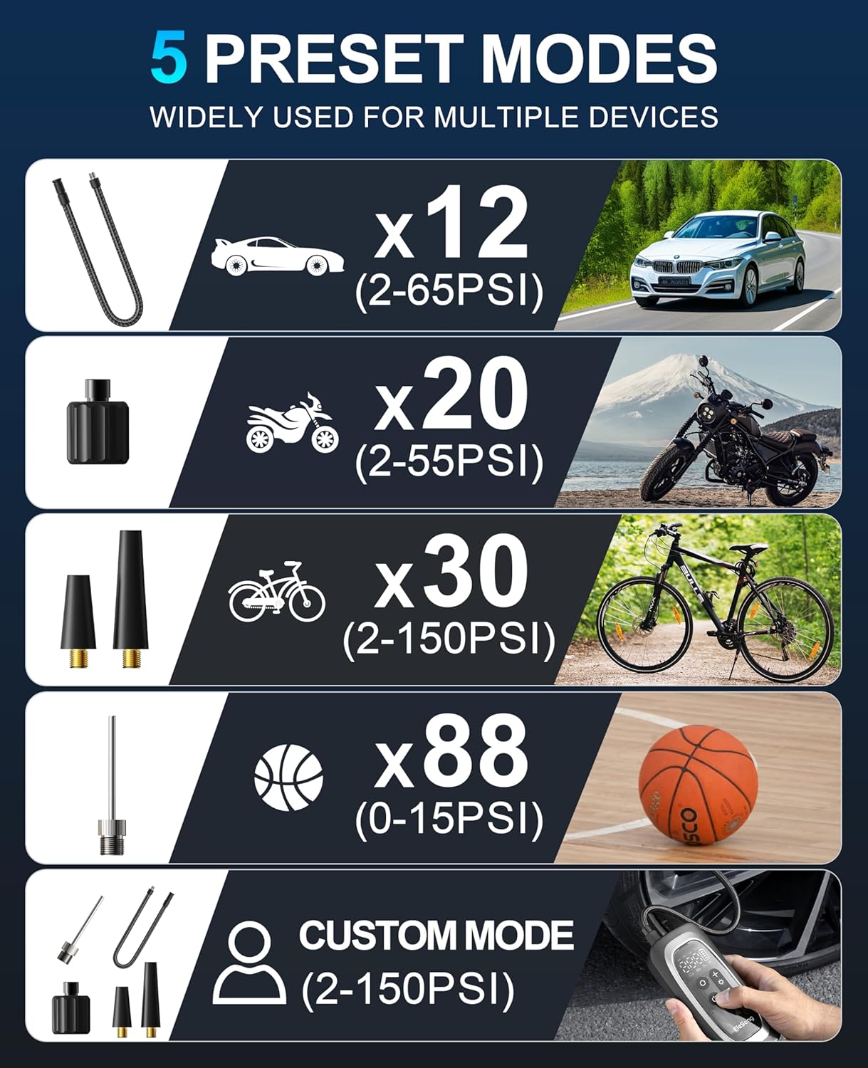 - Runs Cooler & Quieter with Smart Auto Shut-Off: Graphene-enhanced cooling and a high-efficiency motor keep this tire inflator cooler and quieter, even during prolonged use. Just set your target pressure—the device will auto shut off when it’s done, ensuring safety and precision