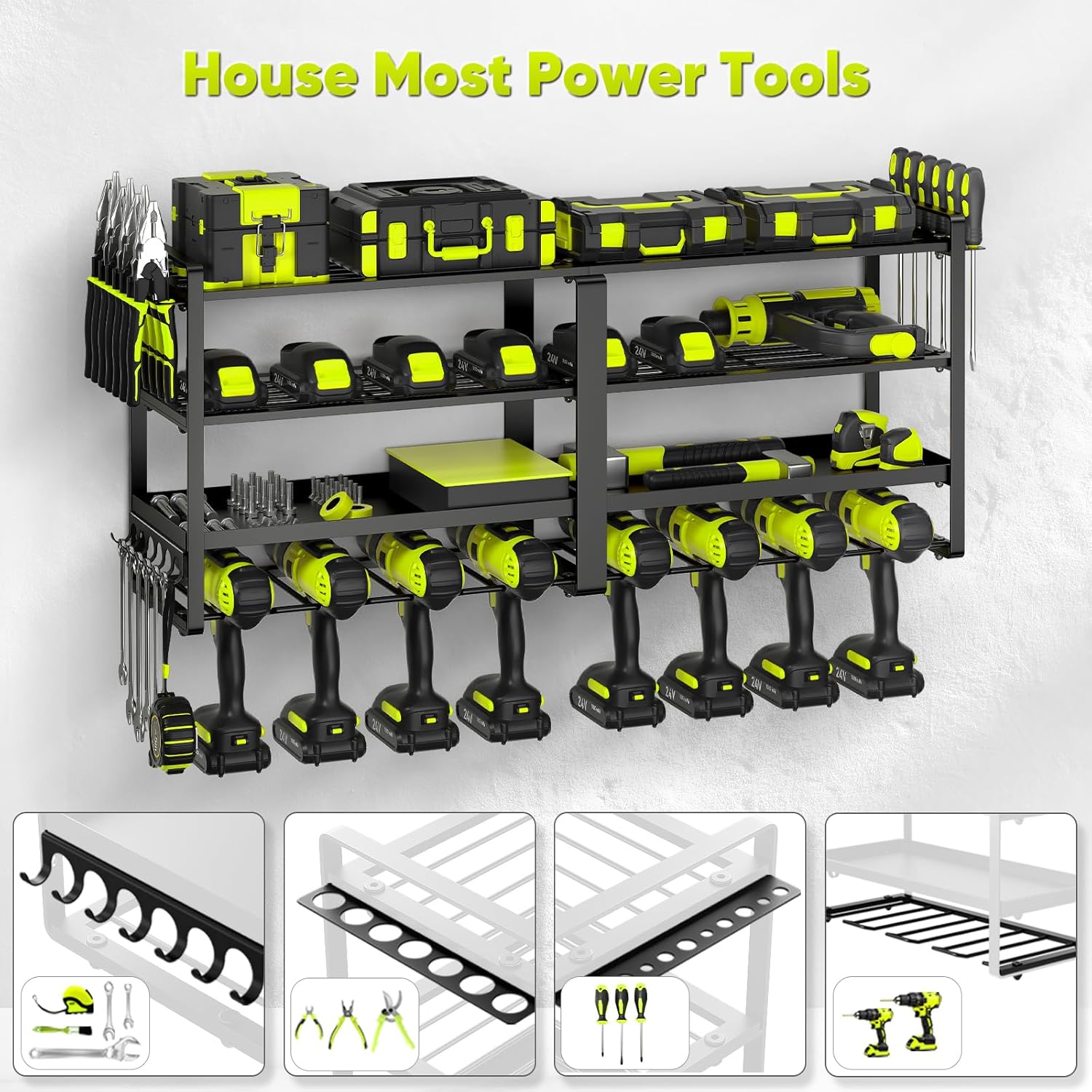 - MULTIFUNCTIONAL INTEGRATED DESIGN REPLACES MULTIPLE STORAGE SOLUTIONS: This utility rack integrates 8 drill brackets, 4-layer storage racks and multiple hanging slots. It is comprehensive in function, reduces the cost of purchasing additional storage tools, and solves all tool storage problems in one stop, saving space and time.