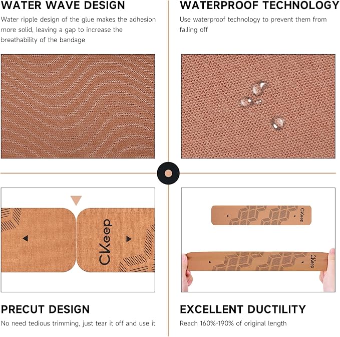 - Waterproof tecnology: CKeep muscle tape uses waterproof technology on the surface of the precut strips, so you can use it even in swimming. The elastic athletic tape's dynamic wave design provides the excellent adhesion and breathability so that you can exercise and sweat without worry.