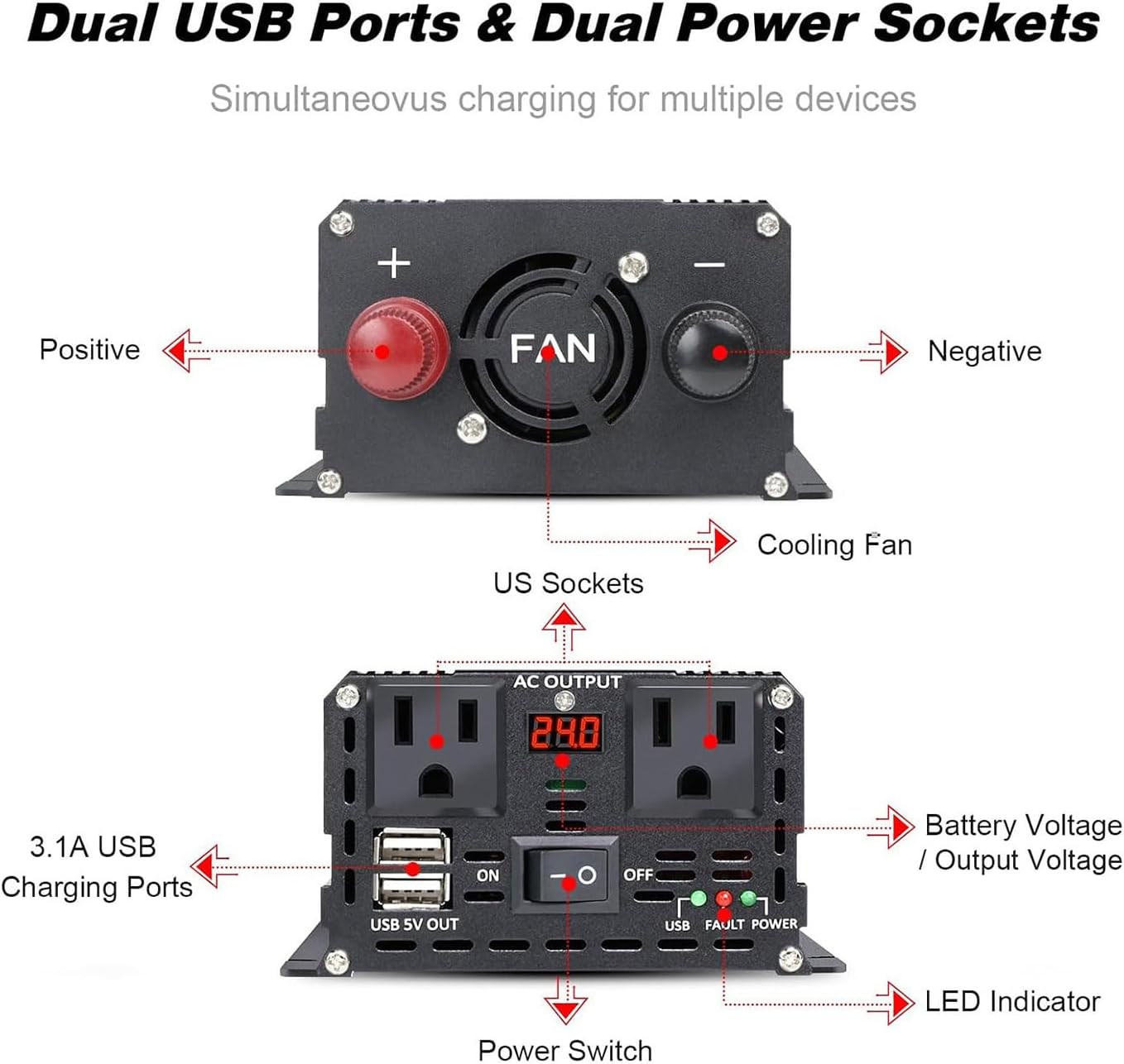 - HIGH QUALITY PURE SINE WAVE OUTPUT: LVYUAN Power Inverter provides continuous and stable 800W pure sine wave power, 1600W peak power with 2 AC outlets, 2 USB ports, easy to power multiple devices at the same time.