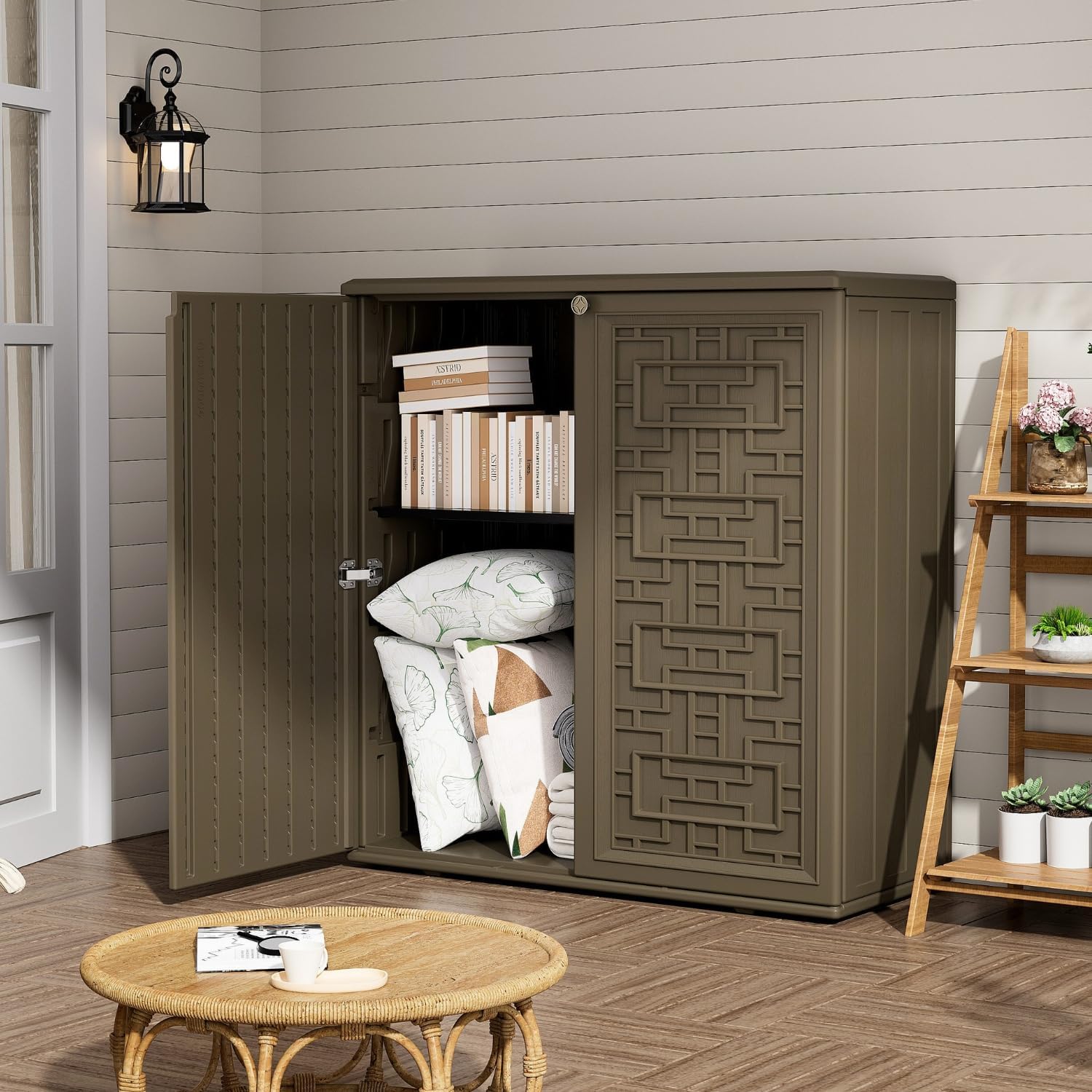 ZZM HDPE Outdoor Storage Shed, Outdoor Plastic Storage Cabinet, Horizontal Resin Tool Shed for Garden, All Weather Outdoor Storage Clearance, DIY Usage, with one Shelf (Coffee)