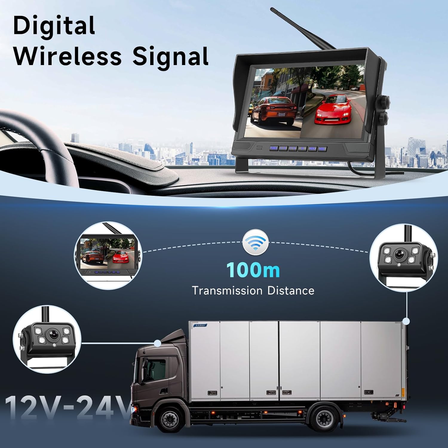 - Digital wireless rear view camera:Digital wireless signal camera, transmission distance over 320 feet, stable signal without delay. Even while driving on the highway, you can observe the road conditions in real time that remain smooth and clear." Wireless" means no cables between the camera and monitor. Simply connect the camera to the monitor via a wireless signal. The camera and monitor need to be plugged in to work