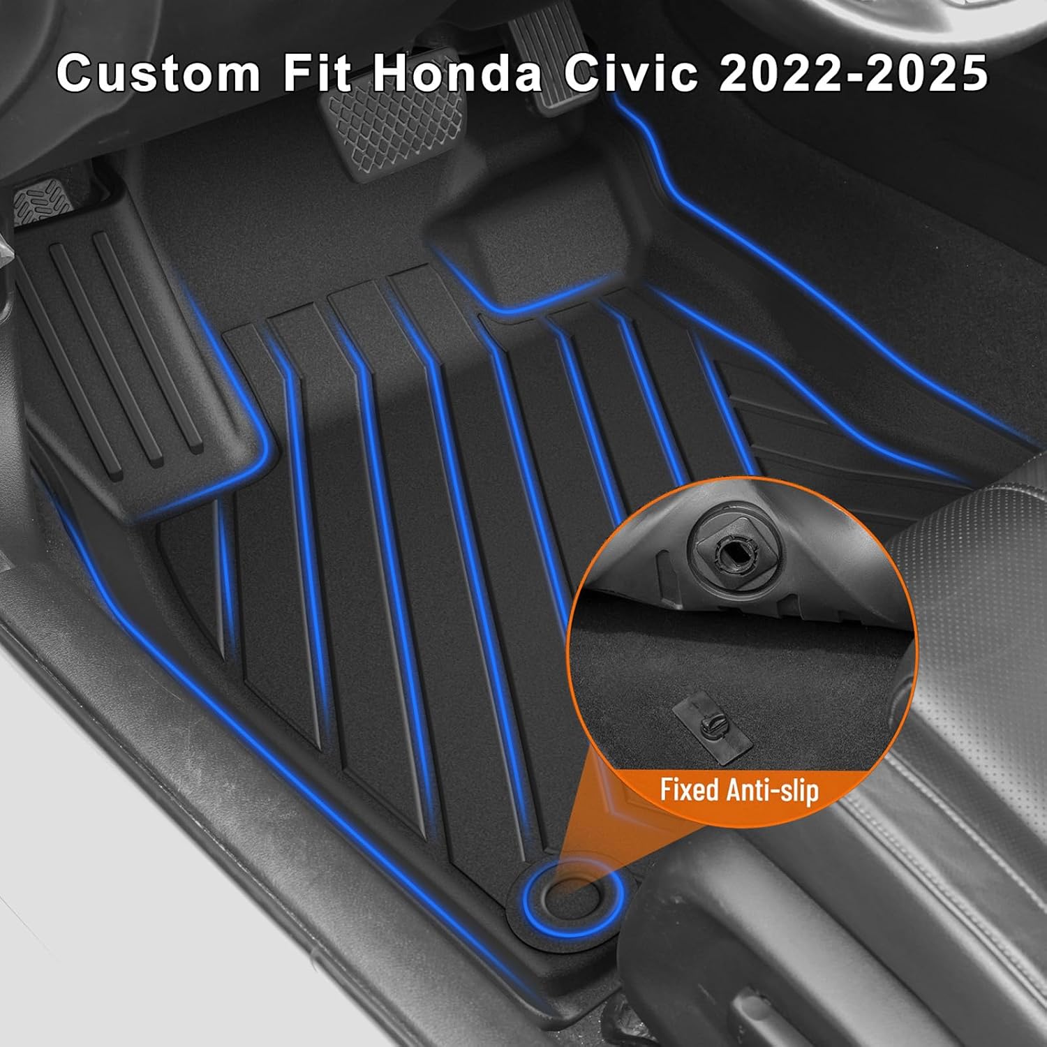 - ăCustom FităOur original floor mats & cargo liner compatible with 2022-2025 Honda Civic Sedan / Si (Not for Hatchback). The whole set of 4 Pcs Includes 2 front floor liners & 1 rear floor mats & 1 trunk liner. Using state-of-the-art 3D laser scanning technology, Made according to 2022-2025 Honda Civic Sedan interior contours, ensuring full coverage and a perfect fit.