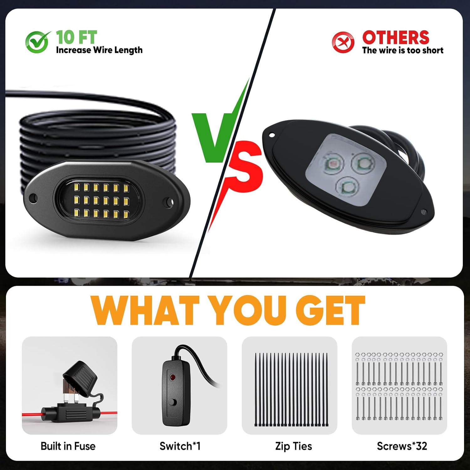 - ăBrilliant Pure White LightăWhite rock lights kits have a 6000K color temperature provides bright, clean illumination, each light is equipped with 18 high-brightness LED beads, providing excellent visibility under your vehicle without the need for complicated color adjustments