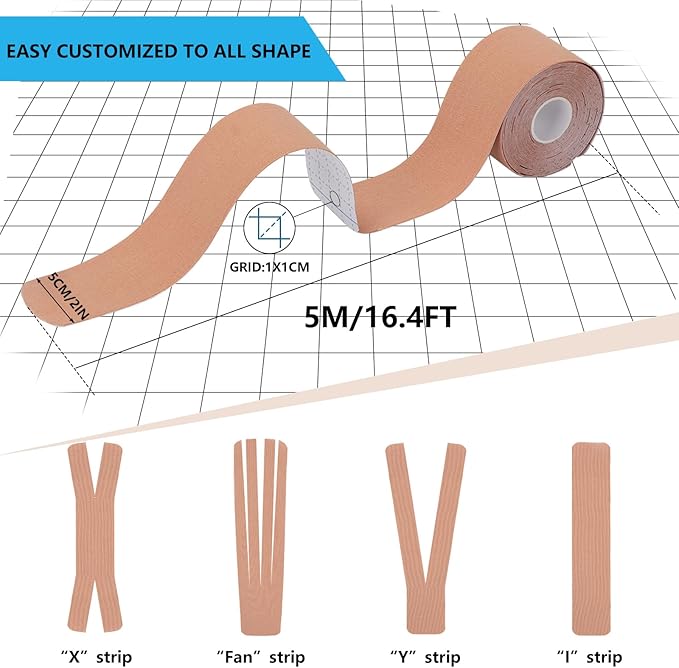 - Comfortable and Breathable: Regular Kinesiology Tape are made of 95% cotton and 5% spandex. It is soft, breathable and flexible for better relaxation of muscles and tissues; the kinesio tape is waterproof and allows moisture to escape without compromising adhesion