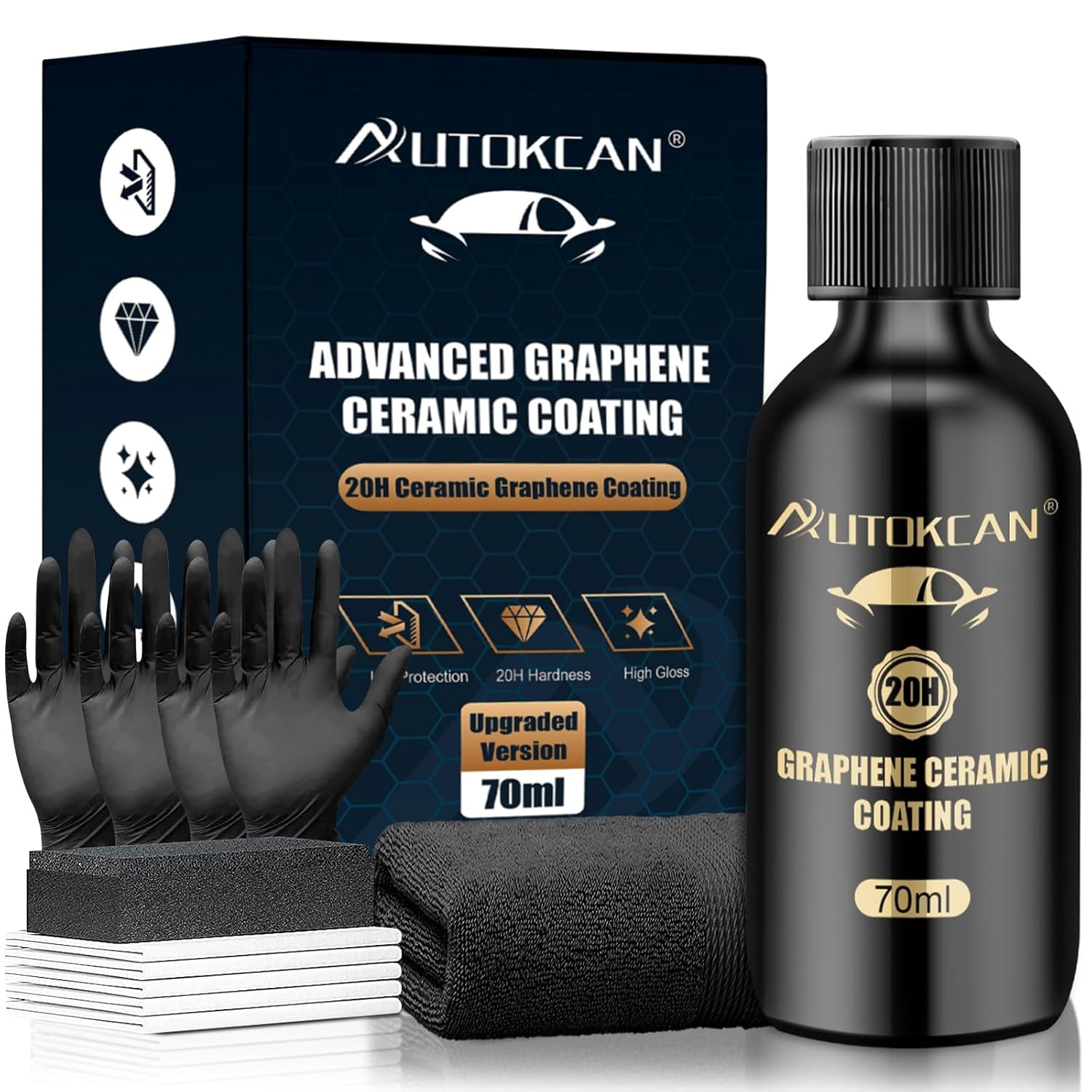 - 20H Hardness and Long Lasting: Autokcan 70ml graphene ceramic coating has 10H hardness and provide up to 3 years protection if applied well after good paint correction. At least 12 months if the clean and apply is not well done. A hardness of 10H is enough to make the coating lasting more than 1 year and even up to 3 years. Normally, hardness above 10H does not exist