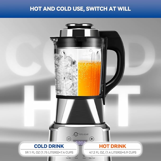 - Heating & Keep-Warm Function β Designed for Comfort β Enjoy soups, nut milks, and warm drinks anytime. The double-layer heat-resistant glass jar blender ensures safety, while the built-in heating element keeps your beverage warm (86β194Β°F/ 30-90Β°C). This licuadora combines power, so your family can enjoy a hot drink even if they arrive home late.