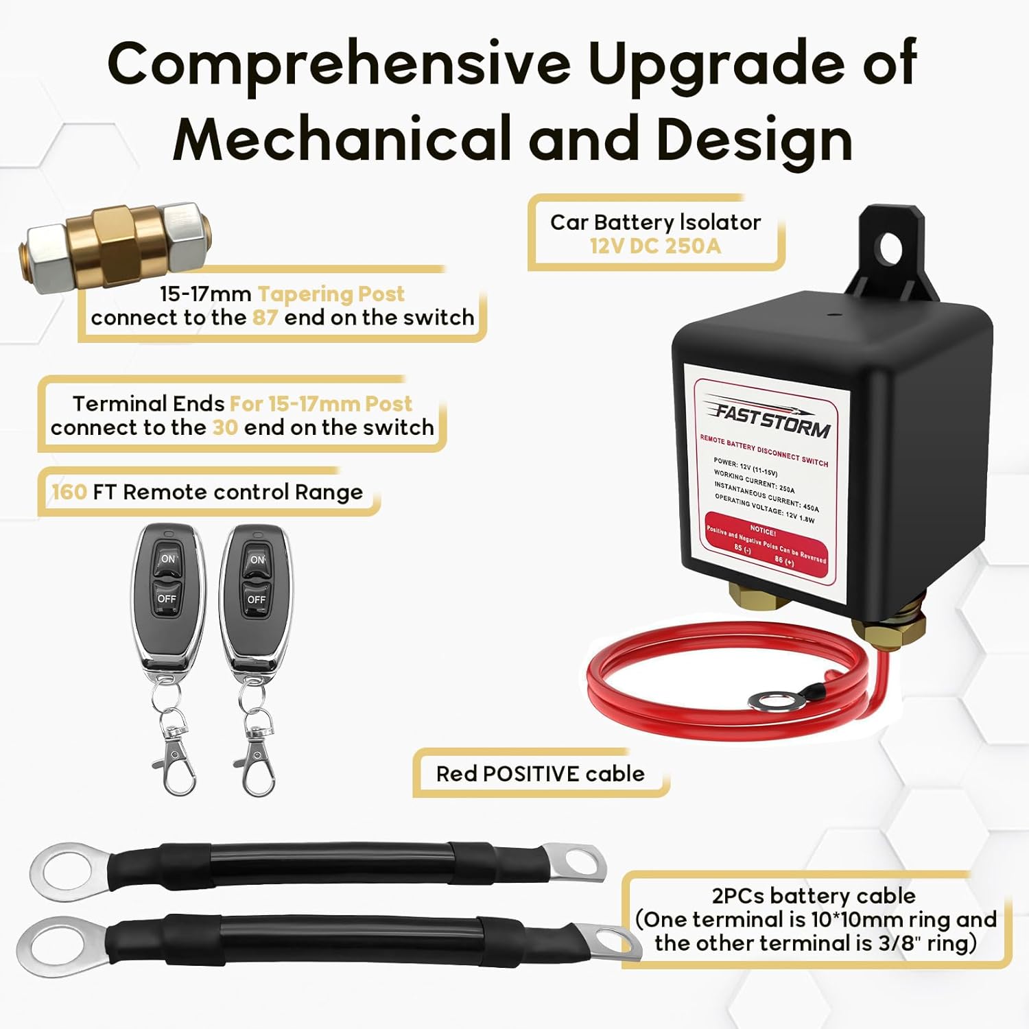 - Premium Quality: Premium Quality: Our top post remote battery disconnect switch is made with high-quality materials and pure copper wire, designed for a 15-17mm Tapering Post, which have larger rivers for better reception performance. Remote battery kill switch Instantaneous current of up to 450A rated current of up to 250A