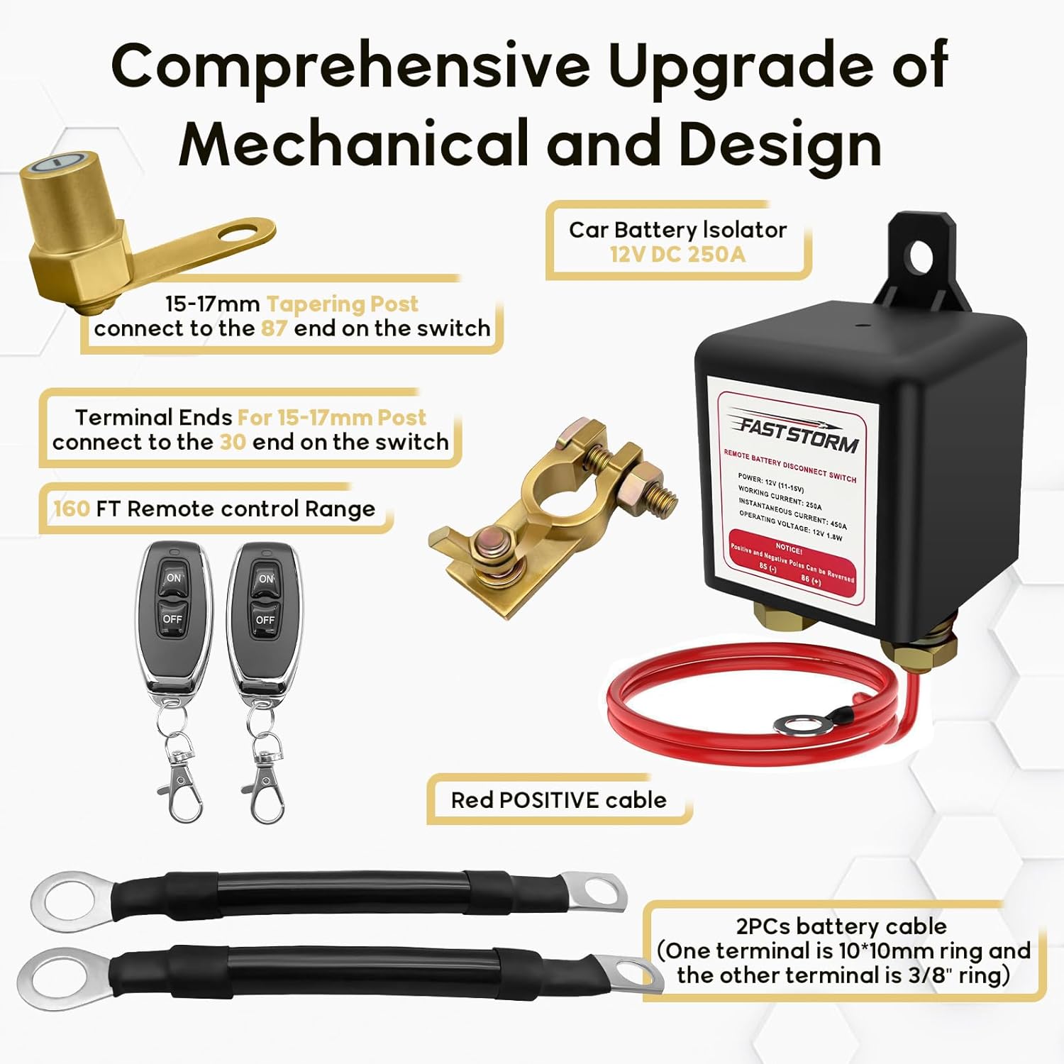 - Premium Quality: Premium Quality: Our top post remote battery disconnect switch is made with high-quality materials and pure copper wire, designed for a 15-17mm Tapering Post, which have larger rivers for better reception performance. Remote battery kill switch Instantaneous current of up to 450A rated current of up to 250A