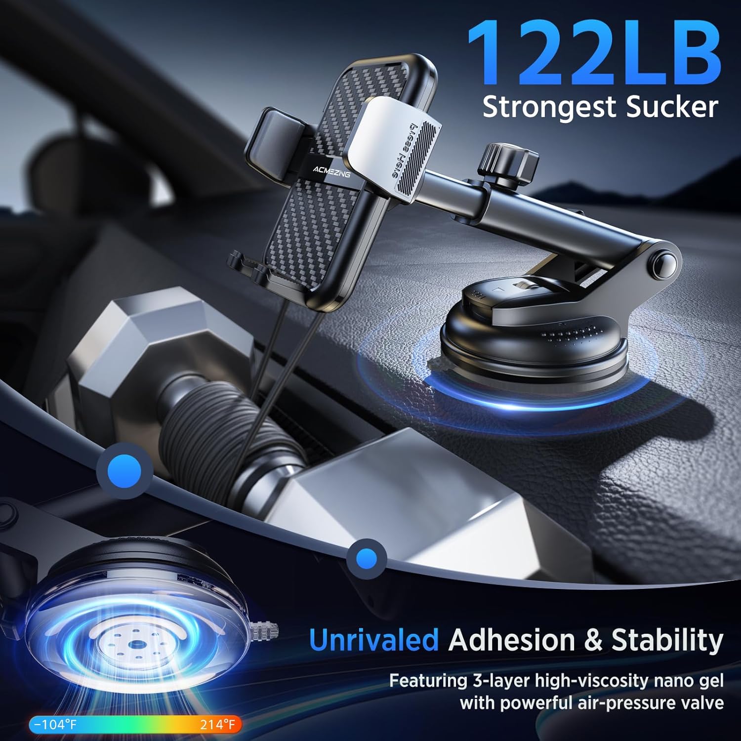 - Unrivaled Adhesion & Stability - Featuring a 3-layer high-viscosity, reusable nano gel with a unique powerful air-pressure valve that enables ACMEZING cell phone car mount to handle 122 pounds+ loads and extreme temperatures (-104°F to 214°F). Whether you're in Florida's heat or Alaska's cold, this phone mount for car securely sticks in your cockpit without any risk of melting or warping. Simply wash with water to restore adhesion, leaving no damage or marks during removal or installation.