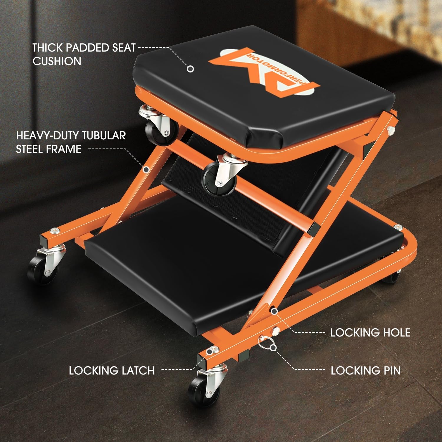 PM PERFORMOTOR 36 Inches Folding 2 in 1 Rolling Z Creeper, Adjustable Roller Garage Chair Lay Down or Sit, 6 Pcs 2" Casters, 150kg Weight Capacity, OrangePM-TOL-CPS36-OG