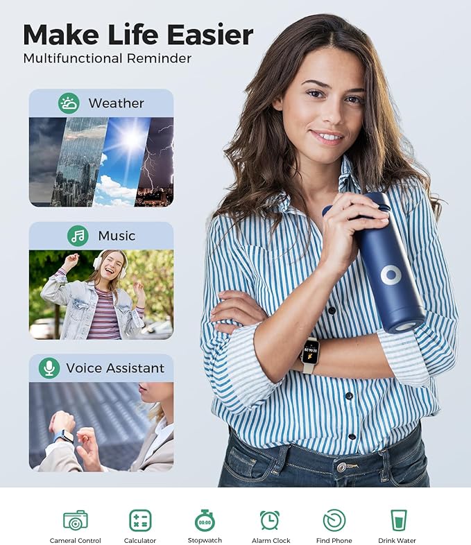 - 【Multiple Practical Functions】The activity trackers and smartwatches with various smart features including menstrual cycle reminder, breathing training, drinking water reminder, sedentary reminder, voice assistant, weather, music, stopwatch, timer, alarm, calculator, find phone, camera control, do-not-disturb mode, making it a convenient assitant in your life. There are 12-hour or 24-hour time display format options and ℉/℃ options, set one style that fits your routines mostly.