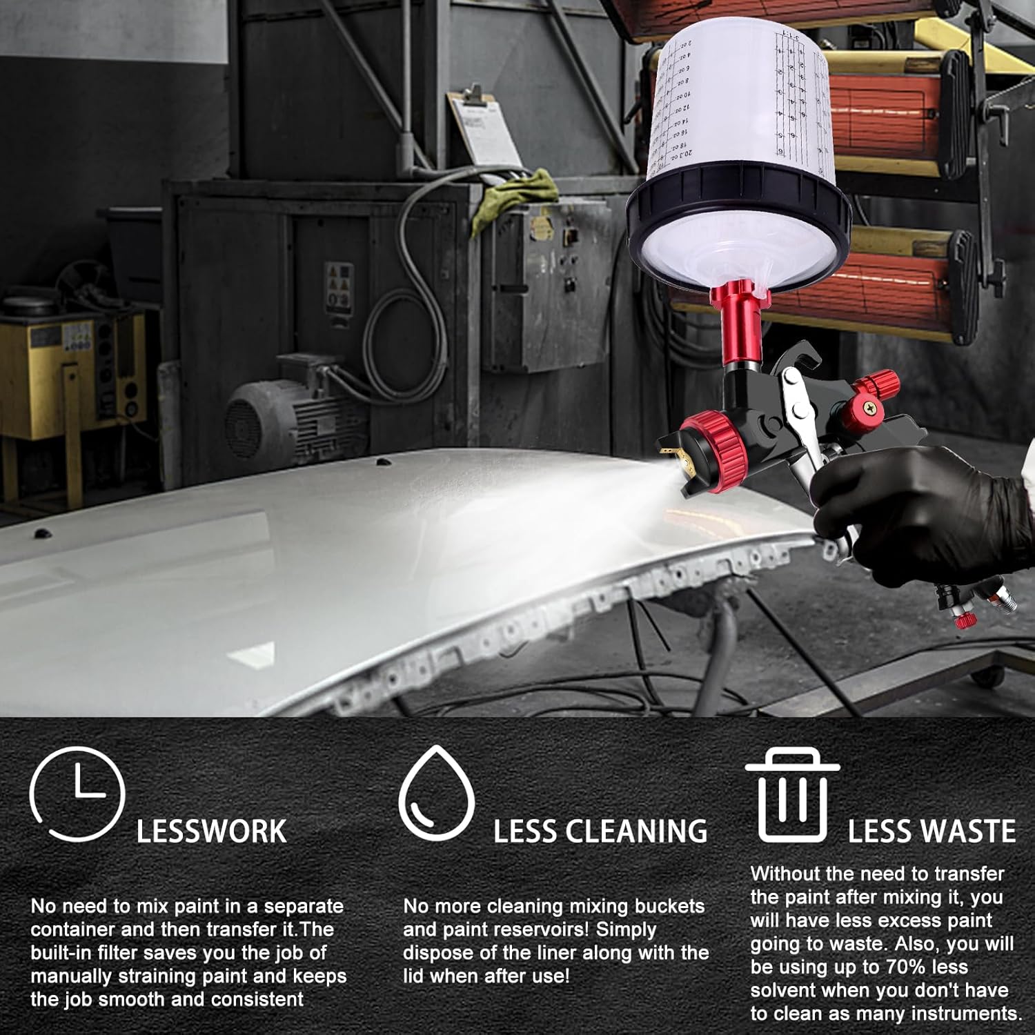 - Mix, spray, and store β it's as easy as that! With spray gun cups, you can mix, spray, refill, and store with ease. They make mixing a breeze, with handy measuring lines that let you mix paint directly with the liner. And when it's time to clean up, it's a breeze too β just replace the spare liner. Plus, you can store unused paint with the cup plug, saving you time and effort in the long run. This handy, disposable system is great for saving paint, cleaning solvents, labour costs, and time.
