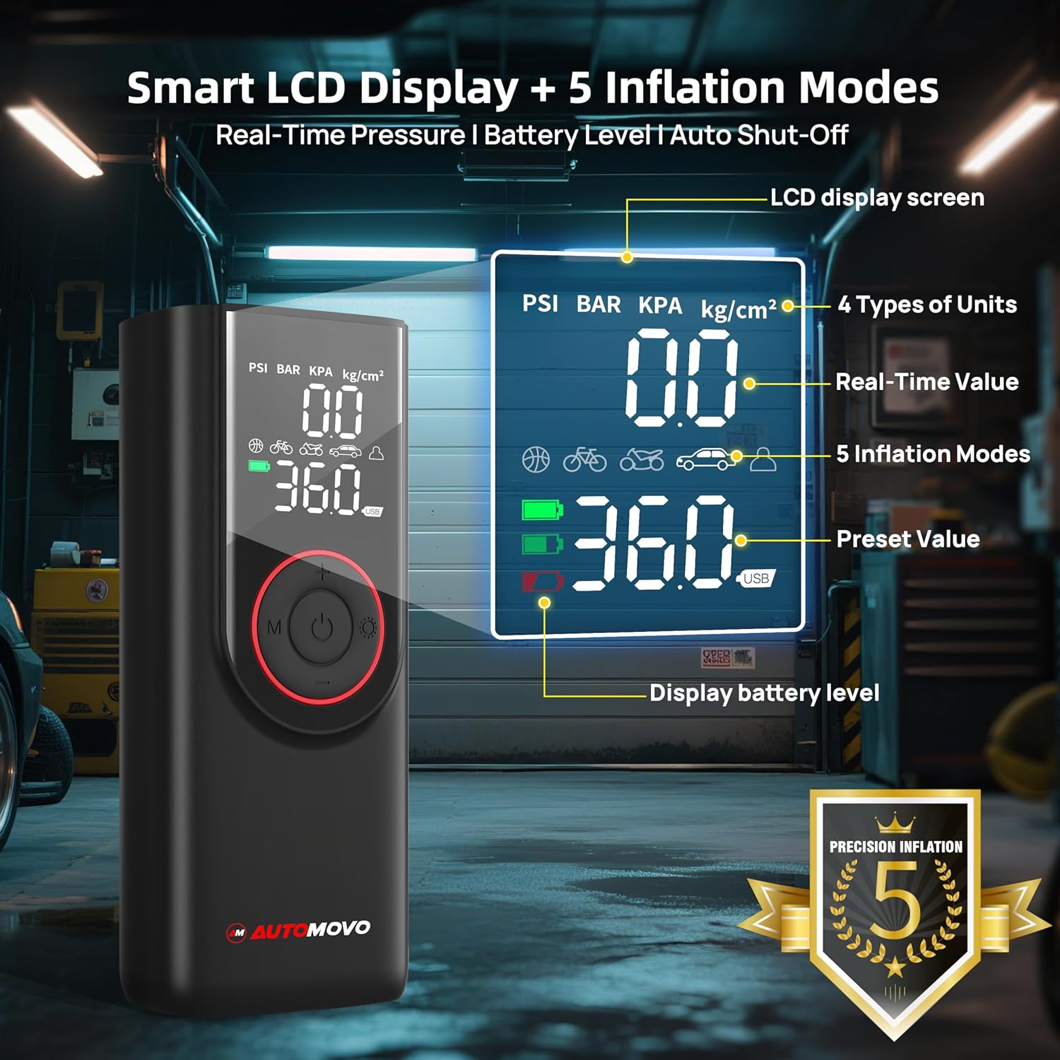 - Air inflator pump equipped with high-performance chip and powerful motor, with max pressure of 150 PSI, plus 35L/min airflow, which increases the inflation speed by 3X faster, it can inflate 195/65R15 tires from 29 PSI to 35 PSI in less than 1 minutes with auto-shut off function
