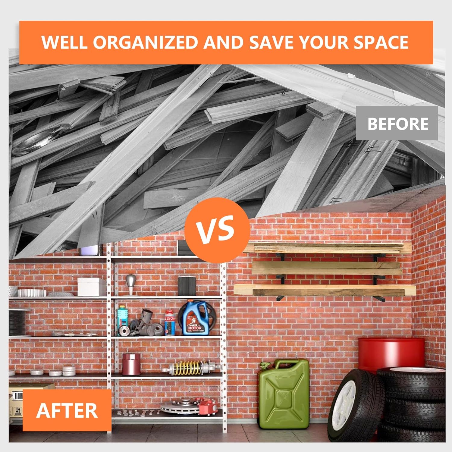 - [Effectively Utilize Space]: Wall-mounted storage racks are the perfect wall storage solution that prevents building materials from being piled up randomly, keeping your garage organized and easy to clean. Save space in your garage, basement, shed, or outdoor workspace. You can use it to store wood, toolboxes, ladders, skis, construction tools, bicycles, ladders, woodworking tools, etc., making it a versatile storage solution.