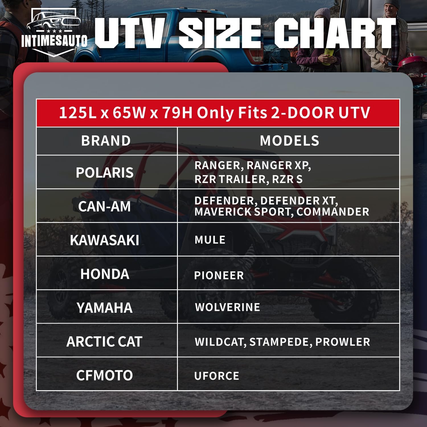 - CONFIRMEDIFT TOOL: These UTV covers (125L x 65W x 79H) are compatible with 2000 2001 2002 2003 2004 2005 2006 2007 2008 2009 2010 2011 2012 2013 2014 2015 2016 2017 2018 2019 2020 2021 2022 2023 2024 most 2-DOOR UTV 4 wheeler as: a. Polaris Ranger, Ranger XP, RZR Trailer, RZR S; b. Can-Am Defender, Defender XT, Maverick Sport, Commander; c. Kawasaki Mule; d. Honda Pioneer; e. Yamaha Wolverine; f. Arctic Cat Wildcat, Stampede, Prowler; g. CFMOTO UFORCE