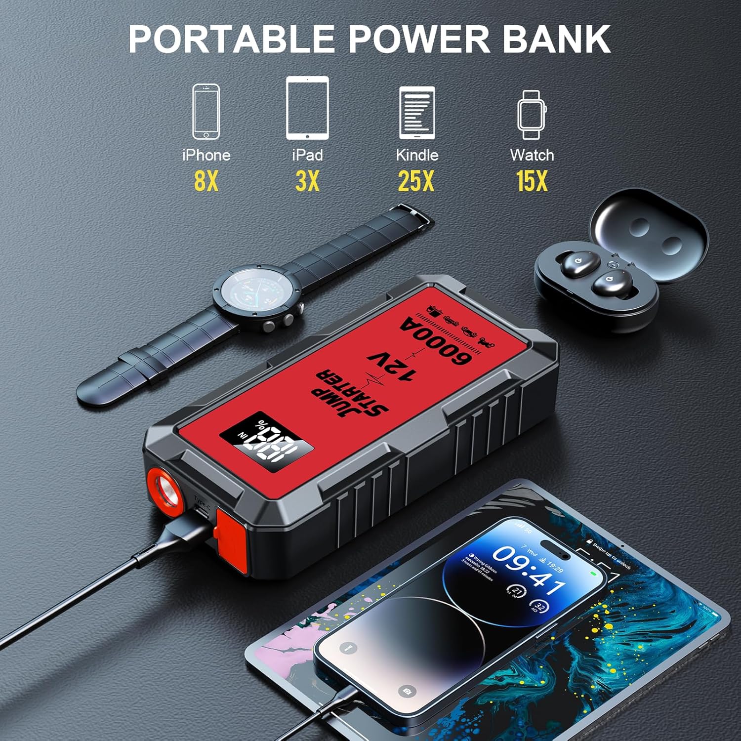 Car Battery Jump Starter with 6000A Peak Smart Clip LCD Display and 3 Modes Flashlight for Up to All Gas and 10.0L Diesel Engine 12V Auto Battery Booster Jumper Cables Portable Lithium Jump Box