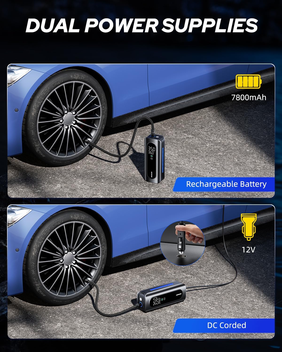 - Convenience to Inflate from Any Angle: Portable tire inflator built in 7800mAh powerful rechargeable battery with an 19.7 inch upgraded anti-scalding and high-pressure hose for cordless convenience. Whatโs more, 12V car power adapter is also available(11.5 FT long wire to cover whole car), providing uninterrupted inflation at any time