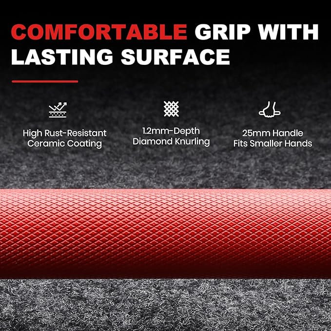 - An Eye-Catching Barbell with Reliable Performance: Crafted from high-grade alloy steel, this 4ft bar is built to withstand the rigors of intense training sessions, ensuring a long-lasting and reliable performance. The sleeves feature a unique black E-coat finish and the shaft is finished with ceramic coating in unique red color, combining corrosion and oxidation resistance with a stylish and elegant appearance.