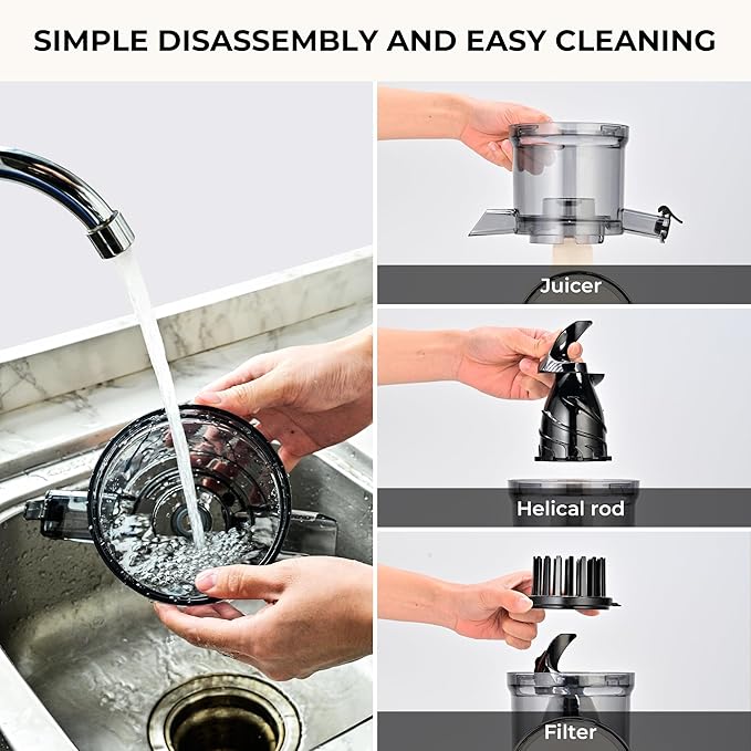 - Easy to Assemble and Clean: Hopper and screen are integrated in the design. To assemble the feed chute, you need to open the lid and turn it clockwise to lock it. The juicing bowl and strainer are streamlined for easy rinsing, and a special brush is included for easier cleaning