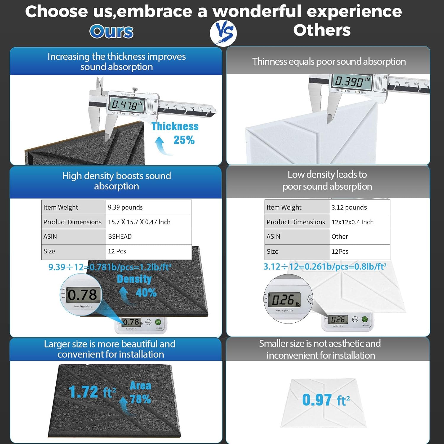 - 【Excellent Quality】: This wall soundproofing foam board is made of high-quality 100% polyester, odorless and flame retardant. There are no risks associated with spending long periods of time in a room with acoustic foam panels. And compared with traditional sound-absorbing panels, our products have higher thickness (25% thicker) and density (35% denser)and larger size (178% more area),which means better durability and sound absorption.