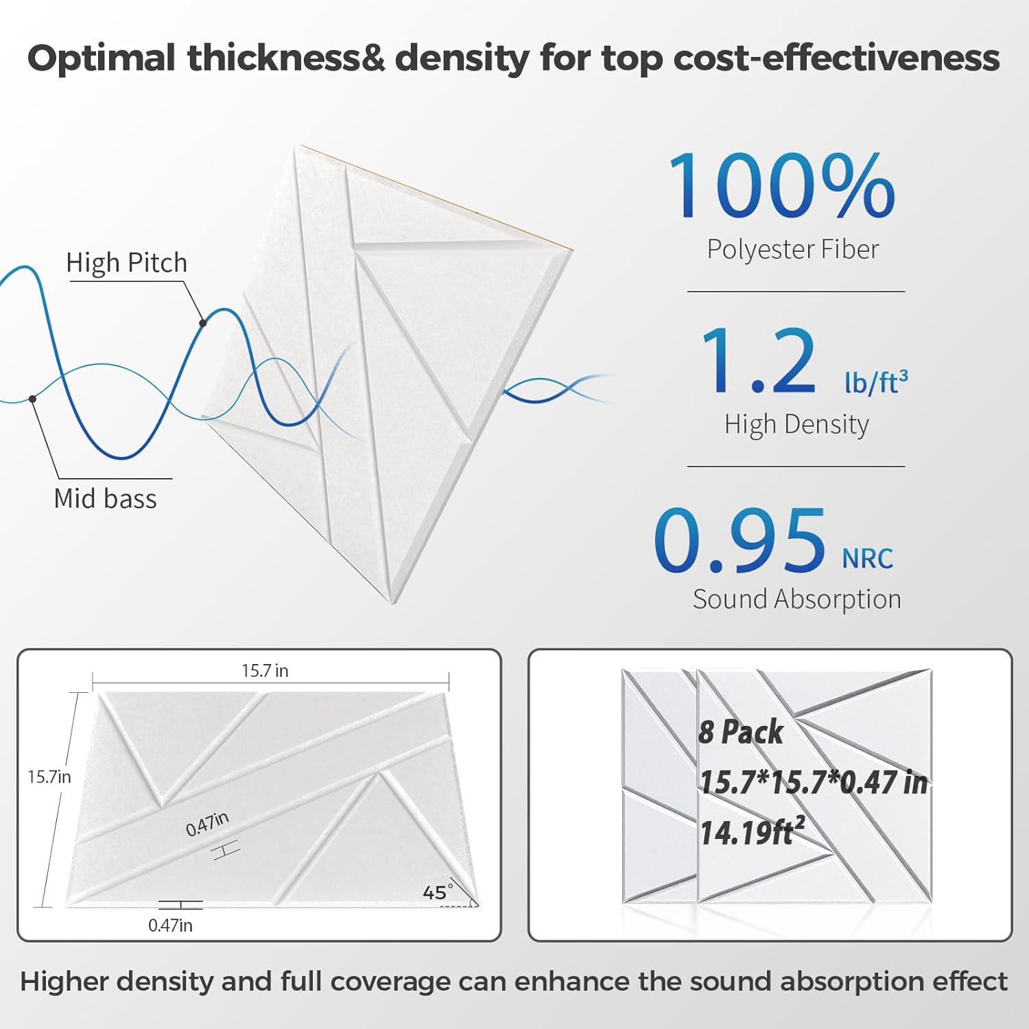 8 Pack Self-Adhesive Soundproof Wall Panels, 15.7 x 15.7 x 0.47 in Sound Proof Foam Panels for Walls, 1.2lb/ft³ High Density, Thicker 0.47in, Large Size Acoustic Panels, Sound Dampening Panels White