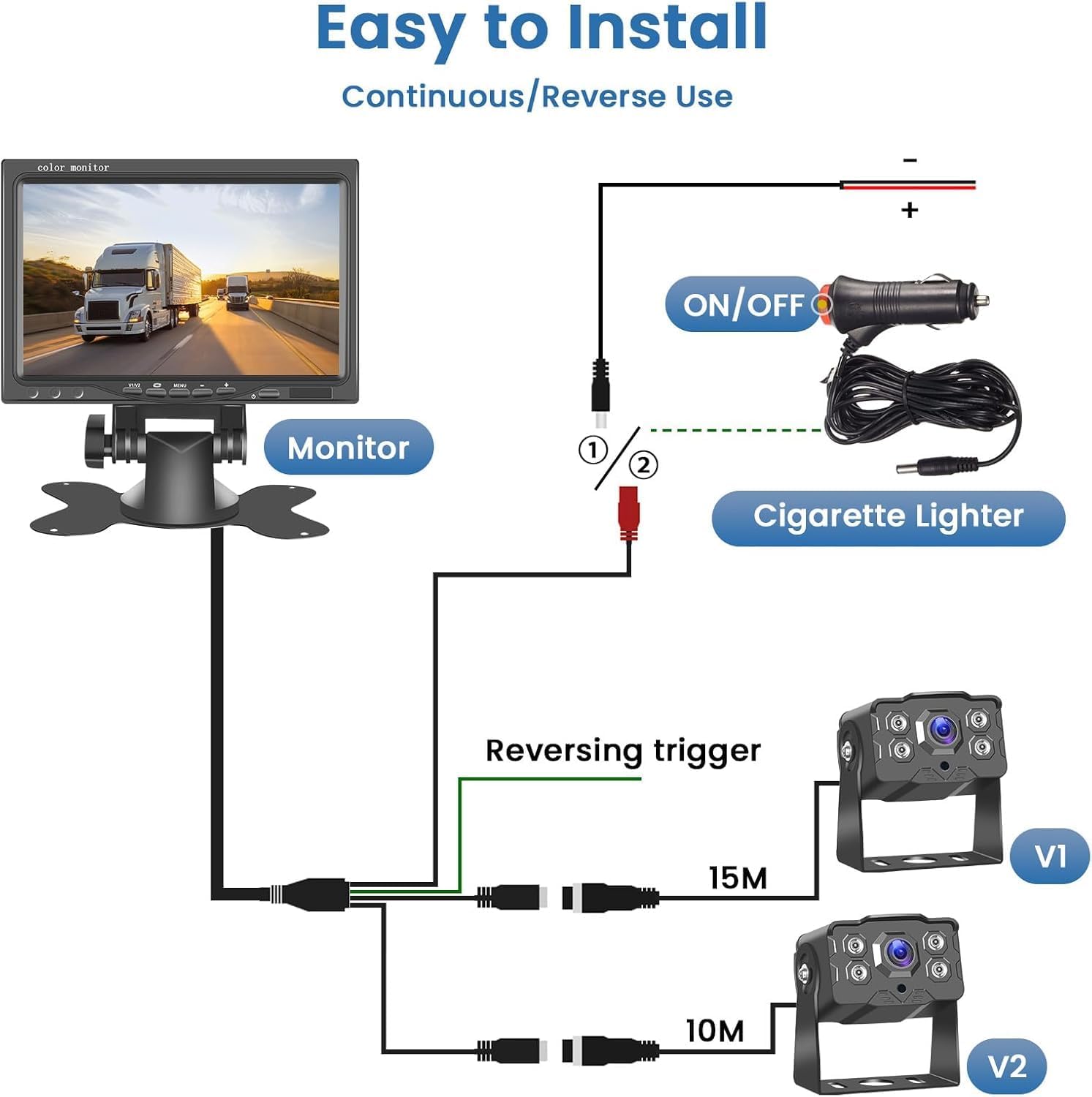 • Easy Installation: The camera and 7 inch monitor with dual cameras and connected by a power cable, the backup camera is a wired system, not a wireless system, but easy to connect and there is no interference. It can be adjusted to the right angle with a bracket up or down