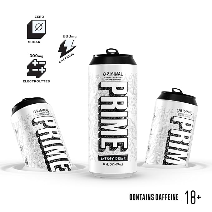 PRIME Energy ORIGINAL, Zero Sugar Energy Drink, 200mg Caffeine and 300mg of Electrolytes for Hydration, Vegan, Gluten Free,16 Fluid Ounce, 12 Pack