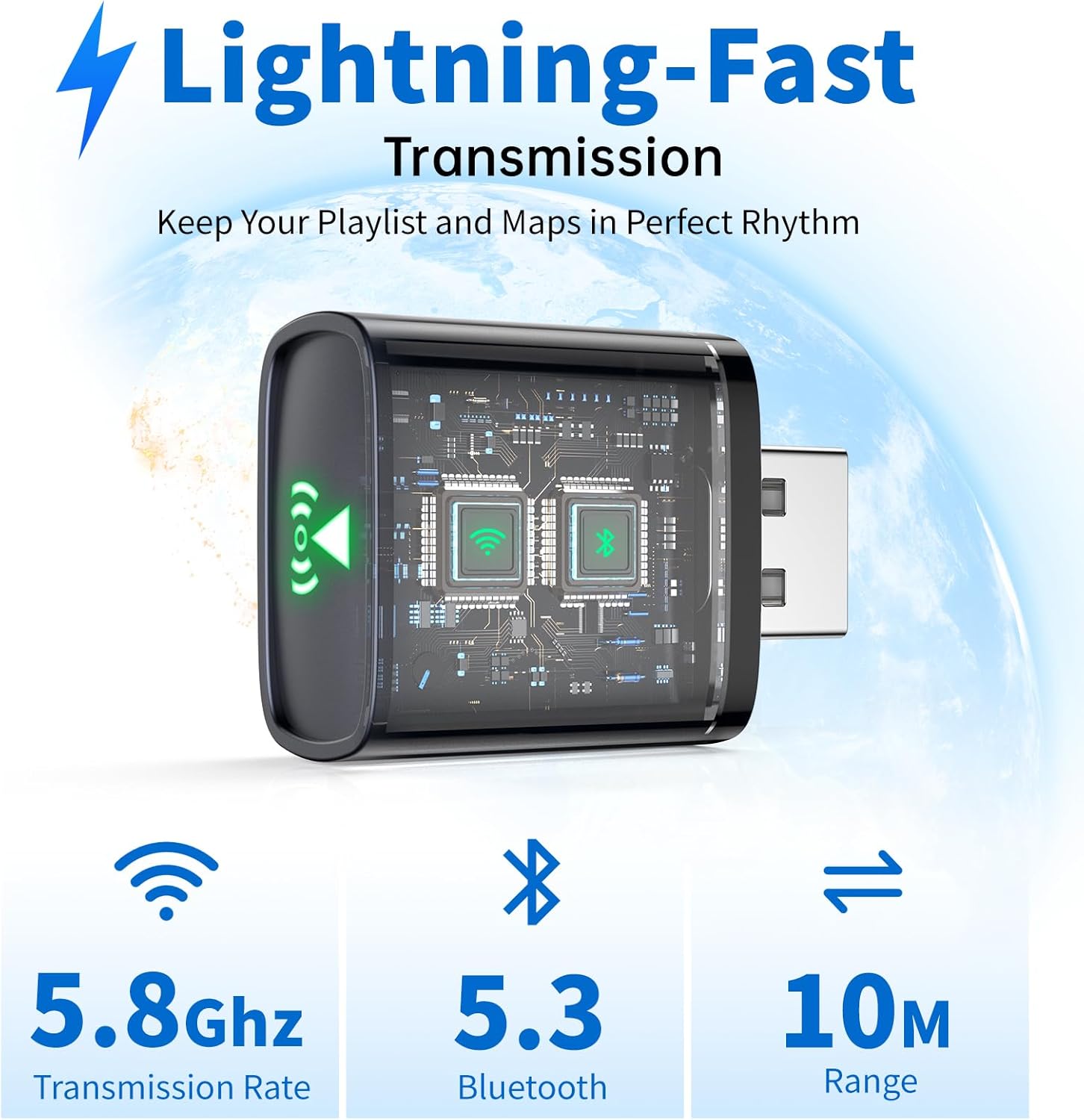 - 🚘【Lightning-Fast Wireless Connection】 Achieve 10-second initial setup and 3-second auto-reconnect with our Apple CarPlay wireless adapter. Equipped with 5.8GHz WiFi and Bluetooth 5.3, it delivers 5x faster transmission than standard adapters. Control navigation, music, calls, and messages seamlessly via Siri or touchscreen, buttons, or knobs—zero daily lag ensures safer driving. (Your Cars must support OEM wired CarPlay and USB C Port)