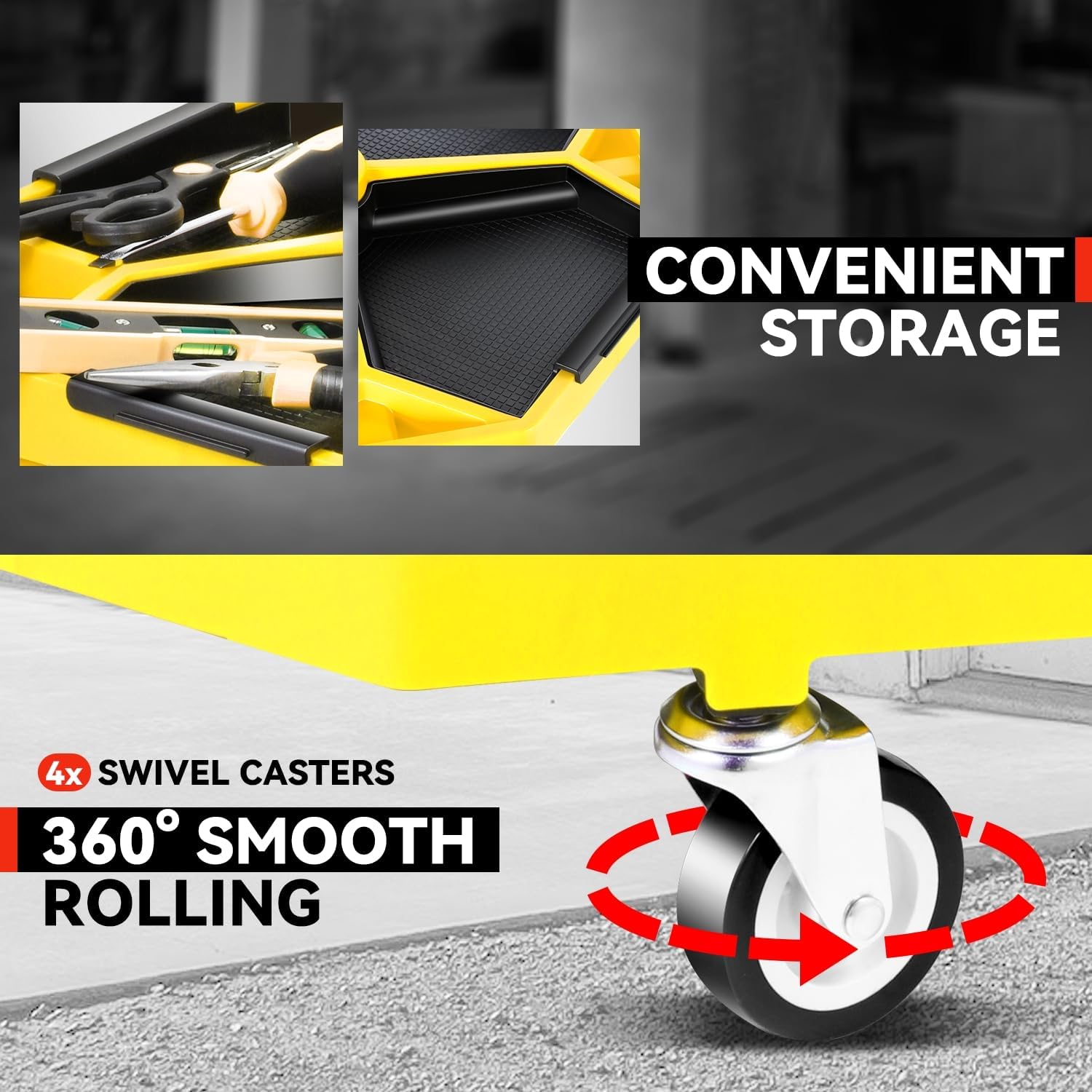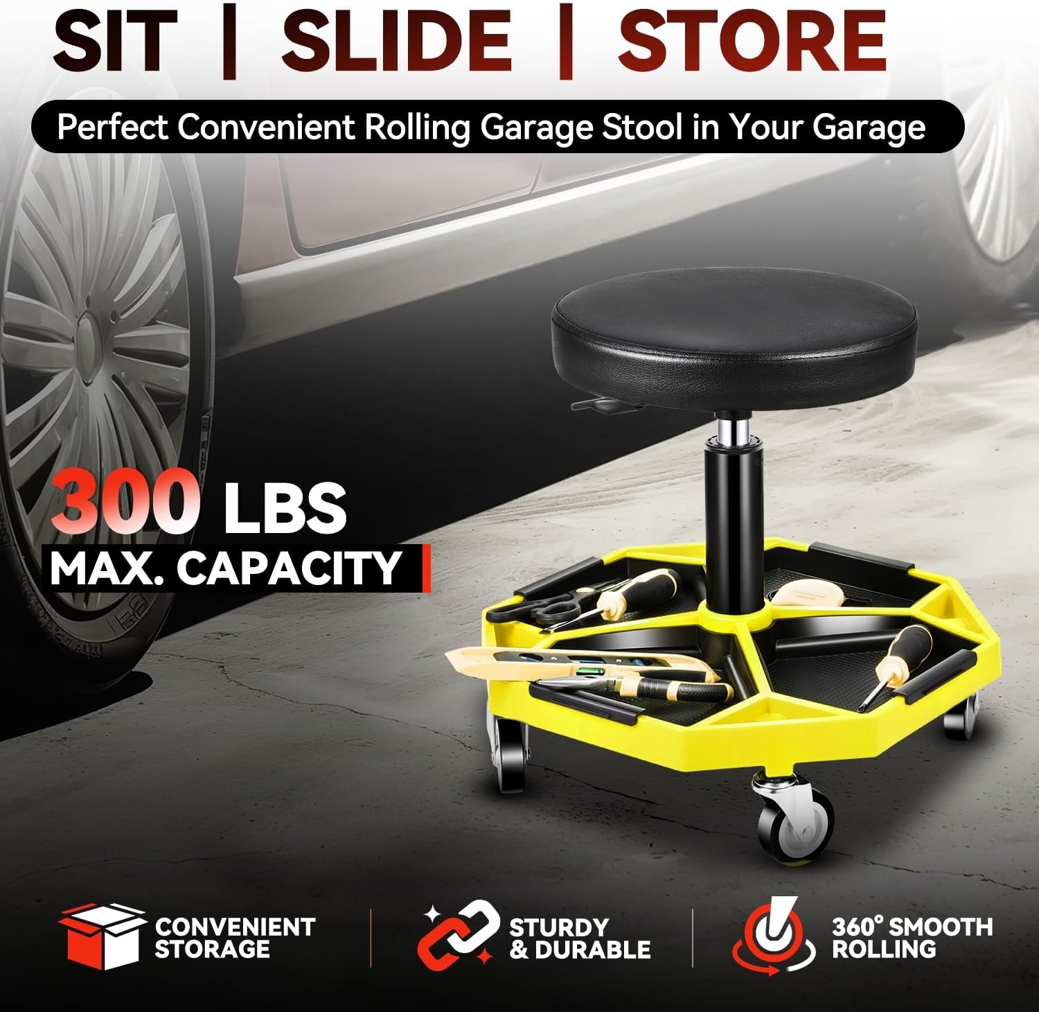 Auto Dynasty Mechanic Stool, Adjustable Rolling Pneumatic Creeper Garage Shop Seat with Tool Tray, 300 LBS Roller Seat for Workshop Auto Repair, Adjustable Height 15.7" to 21", Yellow