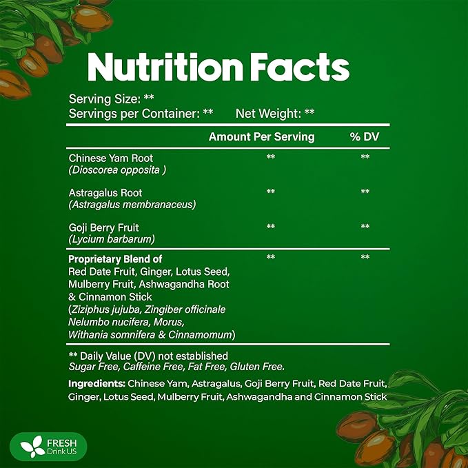 - ☘️ 100% NATURAL INGREDIENTS: Chinese Yam Root, Astragalus Root, Goji Berry Fruit, Red Date Fruit, Ginger, Lotus Seed, Mulberry Fruit, Ashwagandha Root, Cinnamon Stick. We source the finest natural herbs to create our tea, made without additives or artificial flavors, ensuring you receive a pure and authentic taste.