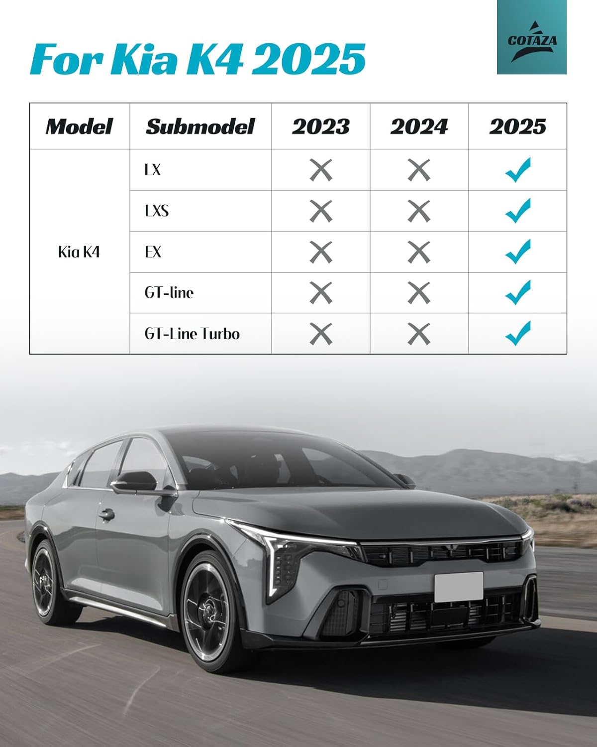 - Precise Positioning:This set of floor mats and cargo liners is meticulously designed for Kia K4 2025, covering trim levels including LX, LXS, EX, and GT-line Turbo. During the design process, the unique structure and dimensions of the 2025 K4's interior space were fully considered to ensure a perfect fit. It's clearly specified that it is not suitable for the 2024 and 2023 models, highlighting its targeted vehicle compatibility.
